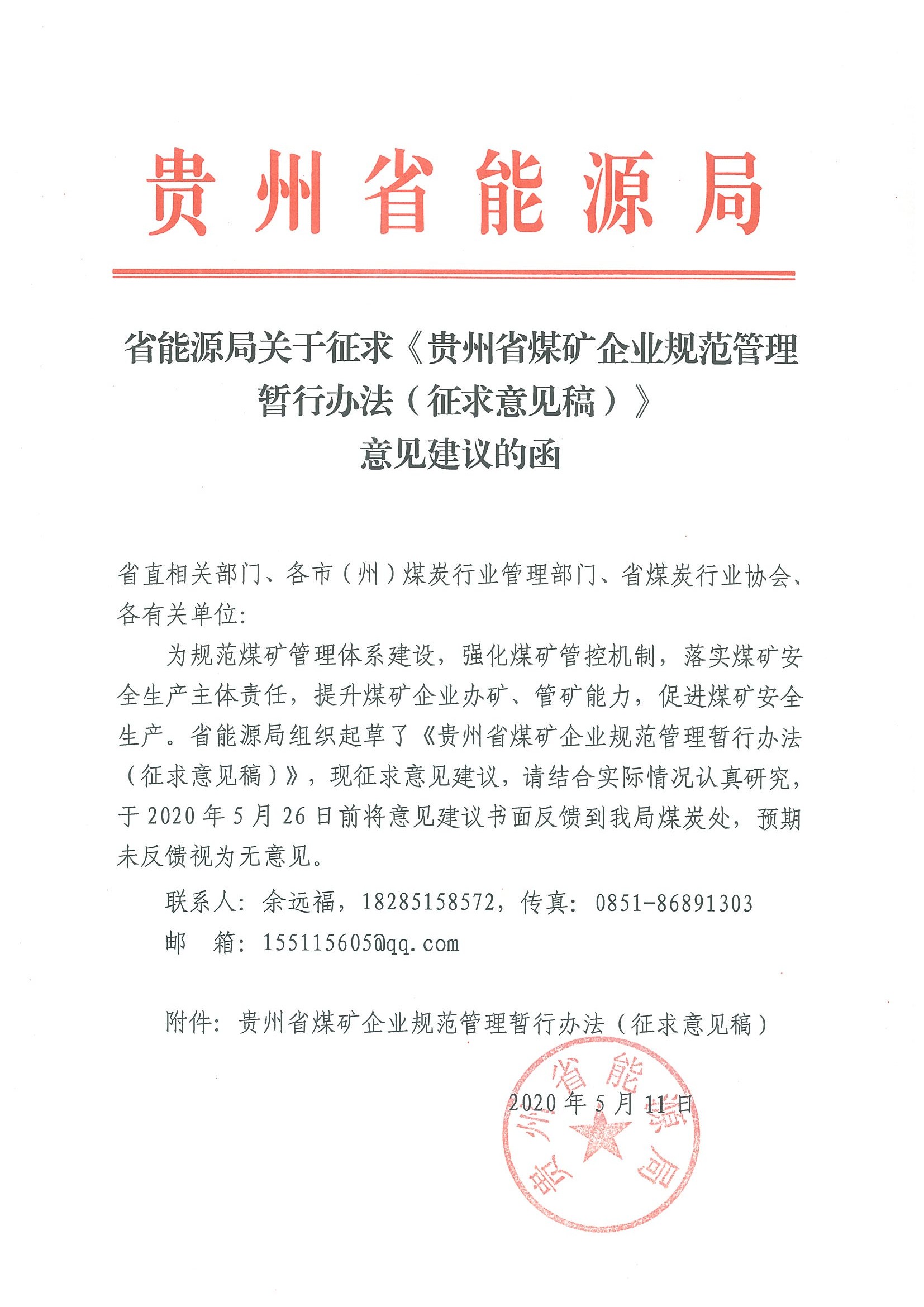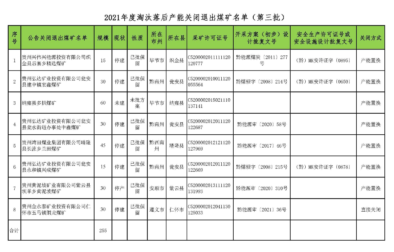 按照《國務院關于煤炭行業化解過剩產能實現脫困發展的意見》(國發〔2016〕7號)、《貴州省人民政府關于煤炭工業淘汰落后產能加快轉型升級的意見》(黔府發〔2017〕9號)精神和要求,現按程序對各煤礦主體企業申請經煤礦所在地政府審核同意的2020年度第五批擬關閉煤礦名單進行公示,公示時間:2020年7月27日至2020年8月2日,凡對公示內容有異議者,請及時以書面形式向省煤炭工業淘汰落后產能加快轉型升級工作領導小組辦公室反映。聯系電話:0851—86891328、86891328(傳真)