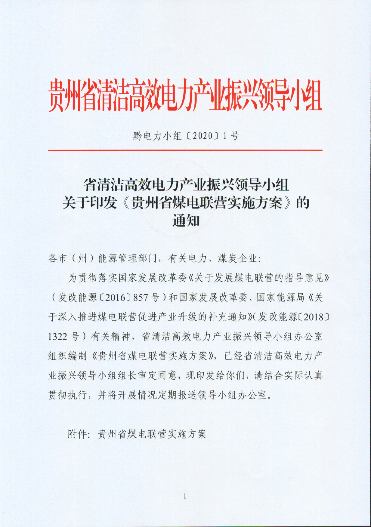 省清潔高效電力產(chǎn)業(yè)振興領(lǐng)導(dǎo)小組關(guān)于印發(fā)《貴州省煤電聯(lián)營(yíng)實(shí)施方案》的通知