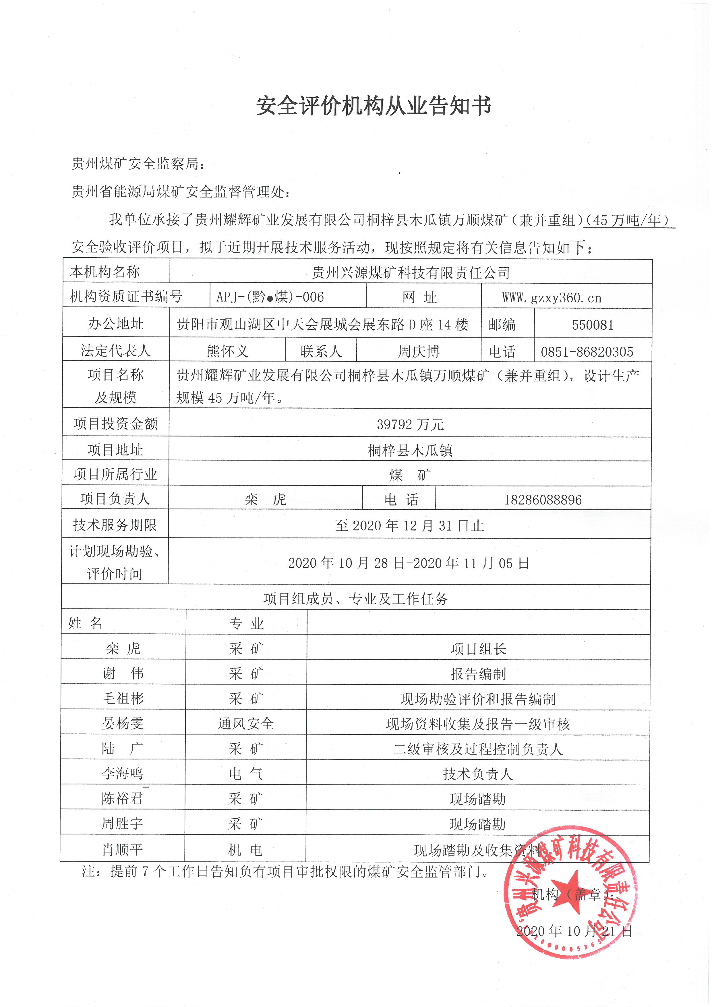 職業病危害評價機構從業告知書[貴州浦鑫能源有限公司六枝特區新華鄉六家壩煤礦]