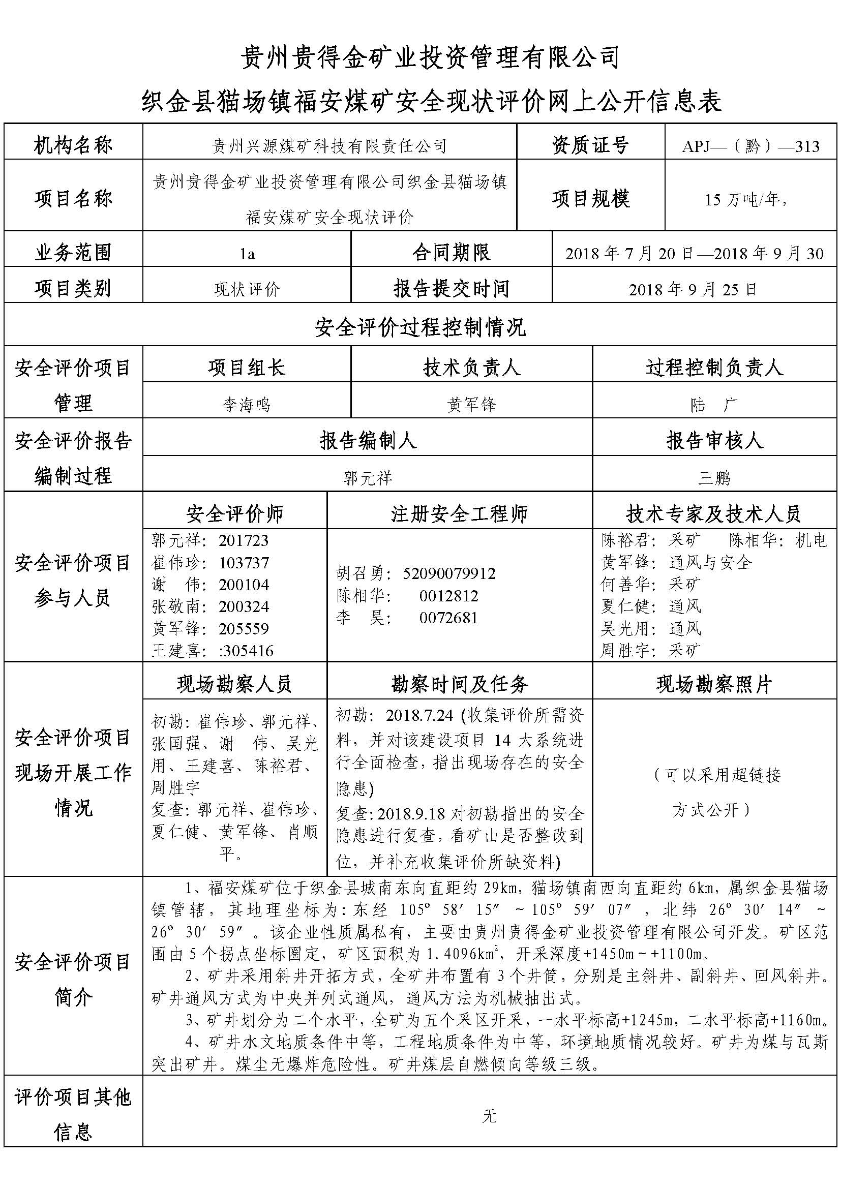 貴州貴得金礦業投資管理有限公司織金縣貓場鎮福安煤礦安全現狀評價網上公開信息表