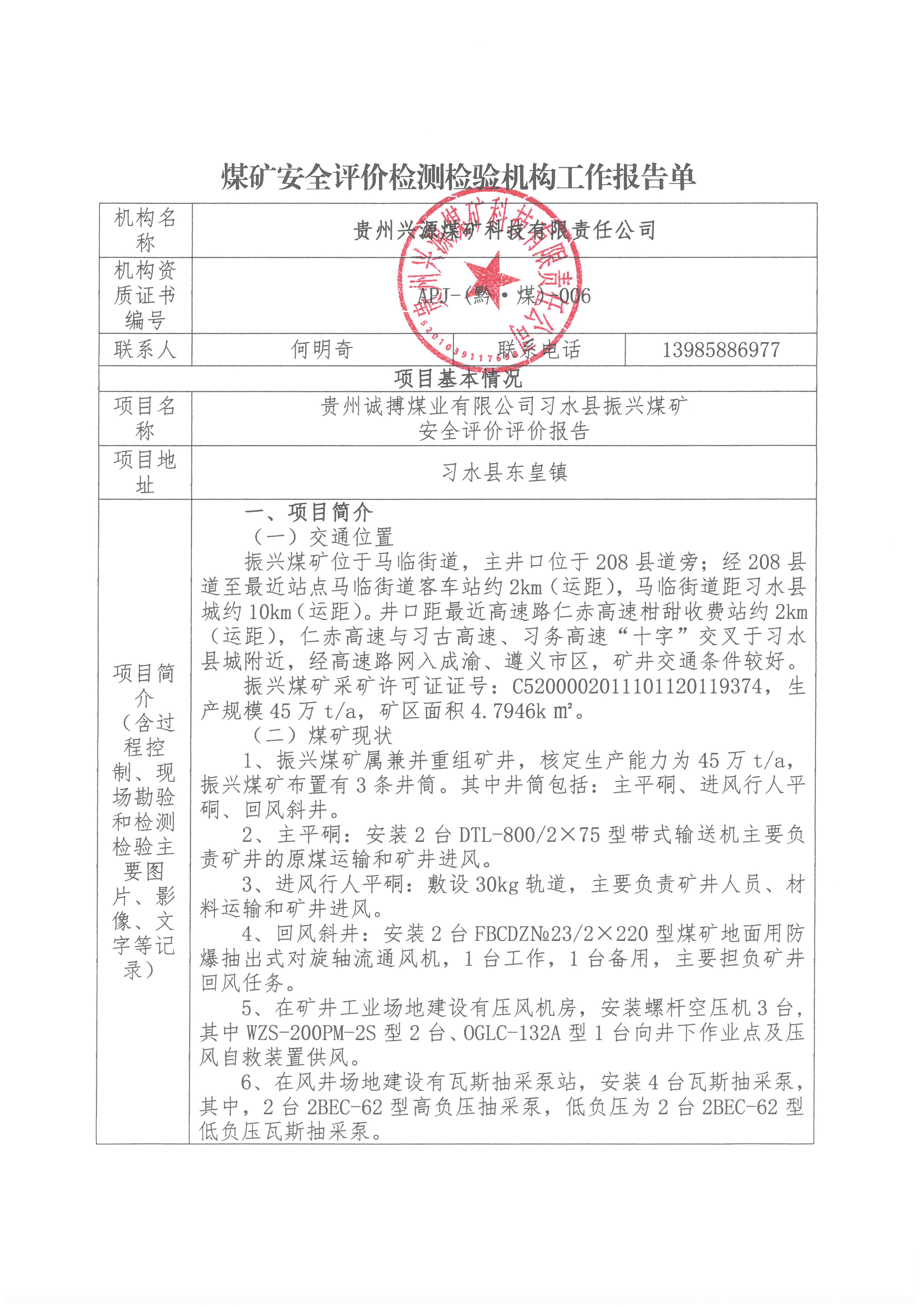 煤礦安全評價檢測檢驗機(jī)構(gòu)工作報告單【貴州誠搏煤業(yè)有限公司習(xí)水縣振興煤礦安全評價評價報告】