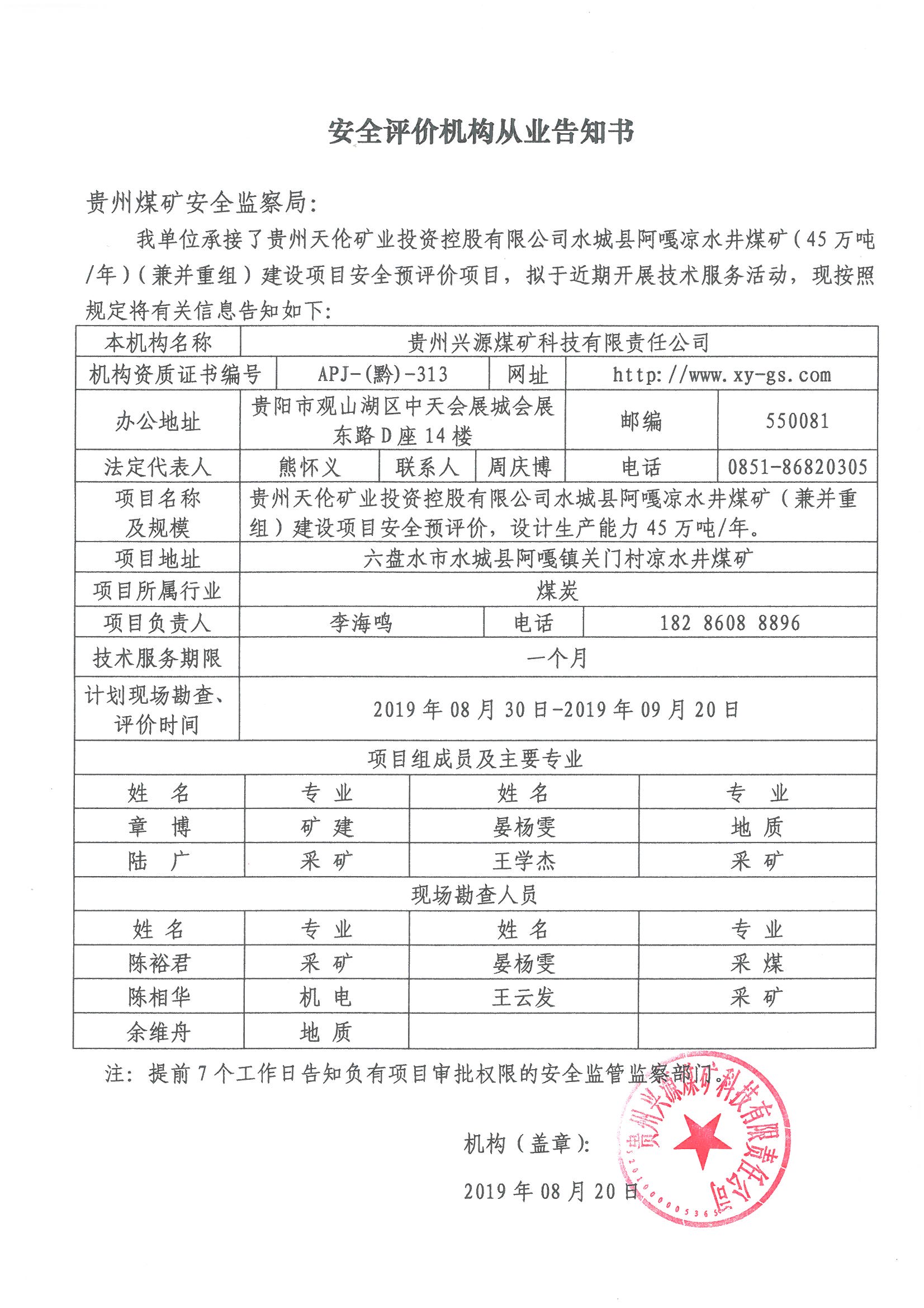 安全評價機(jī)構(gòu)從業(yè)告知書[貴州天倫礦業(yè)投資控股有限公司水城縣阿嘎涼水井煤礦]