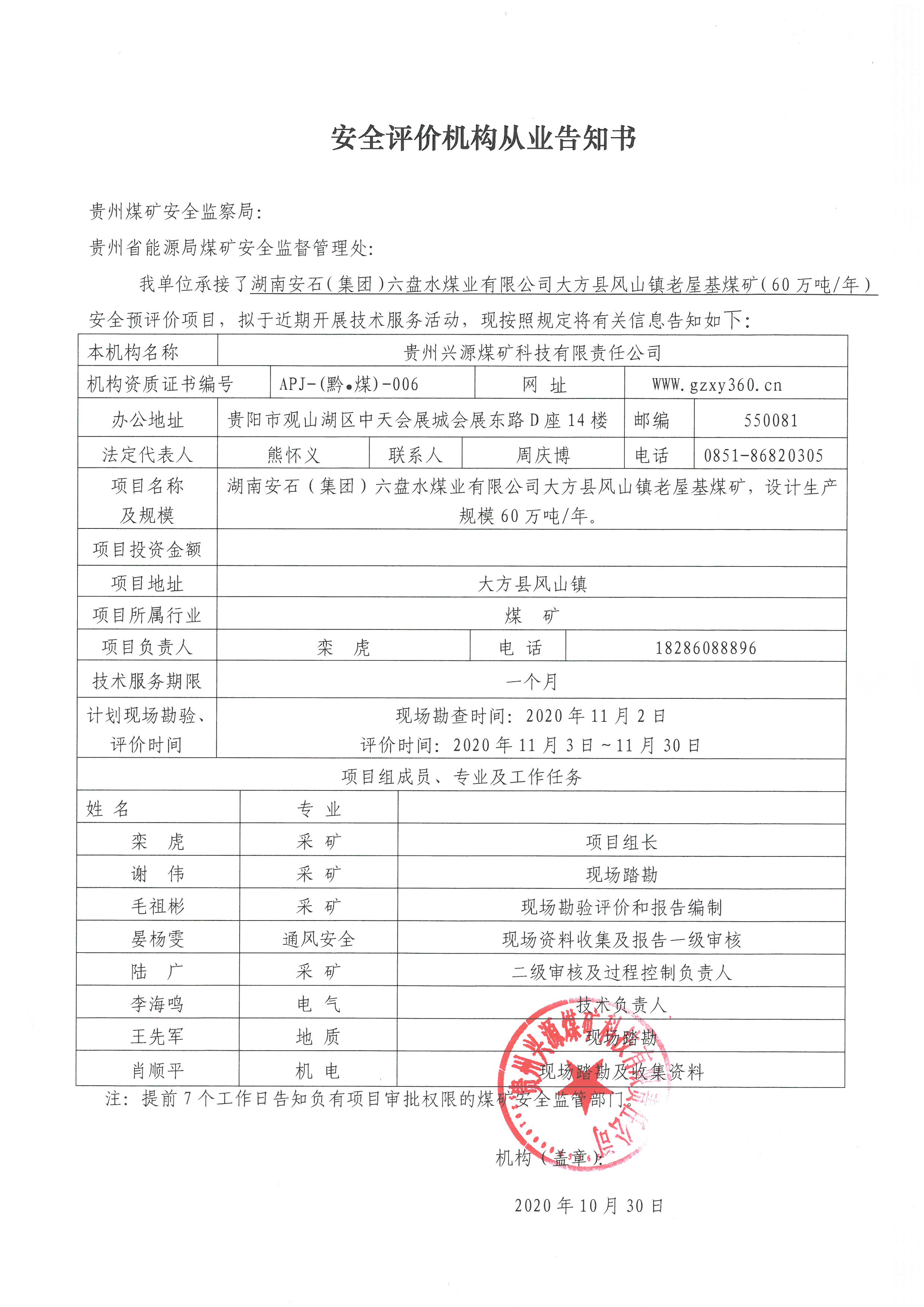 安全評價機構(gòu)從業(yè)告知書【湖南安石(集團)六盤水煤業(yè)有限公司大方縣風(fēng)山鎮(zhèn)老屋基煤礦】