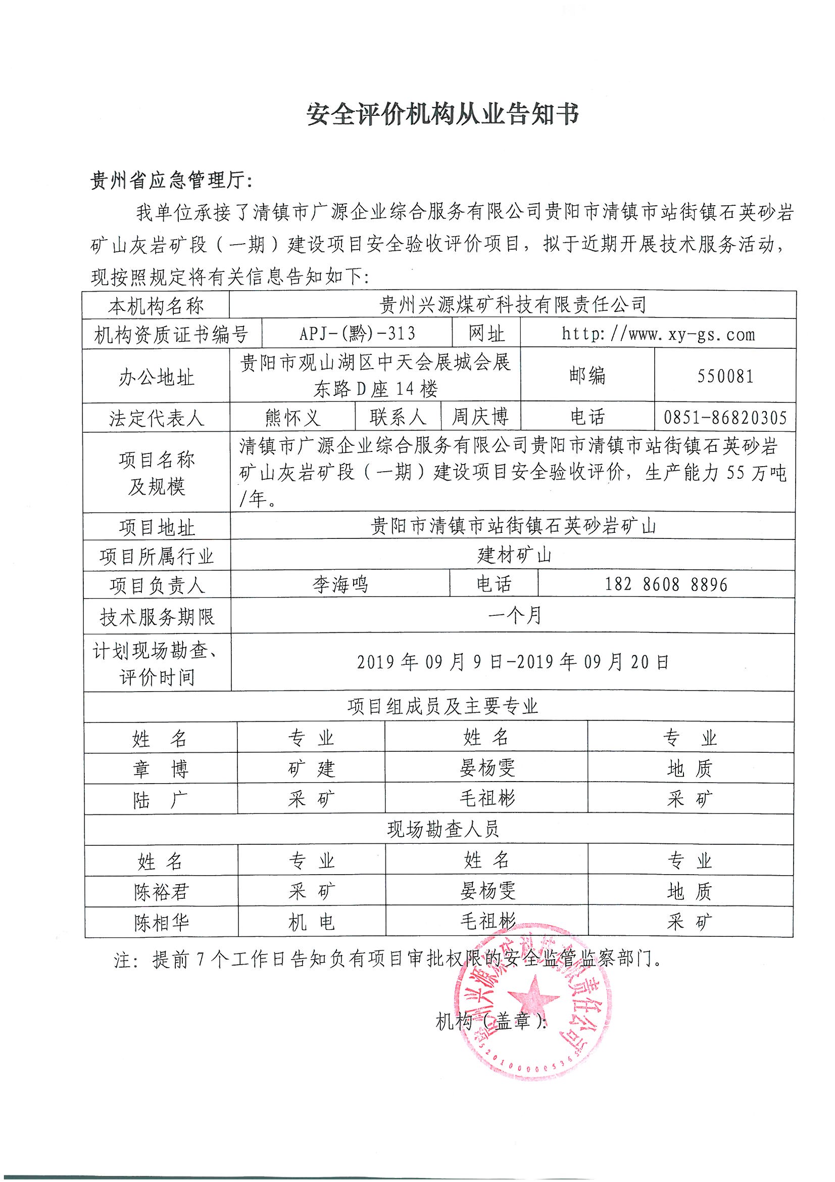 安全評價機構從業告知書【清鎮市廣源企業綜合服務有限公司貴陽市清鎮市站街鎮石英砂巖礦山灰巖礦段(一)期建設項目】