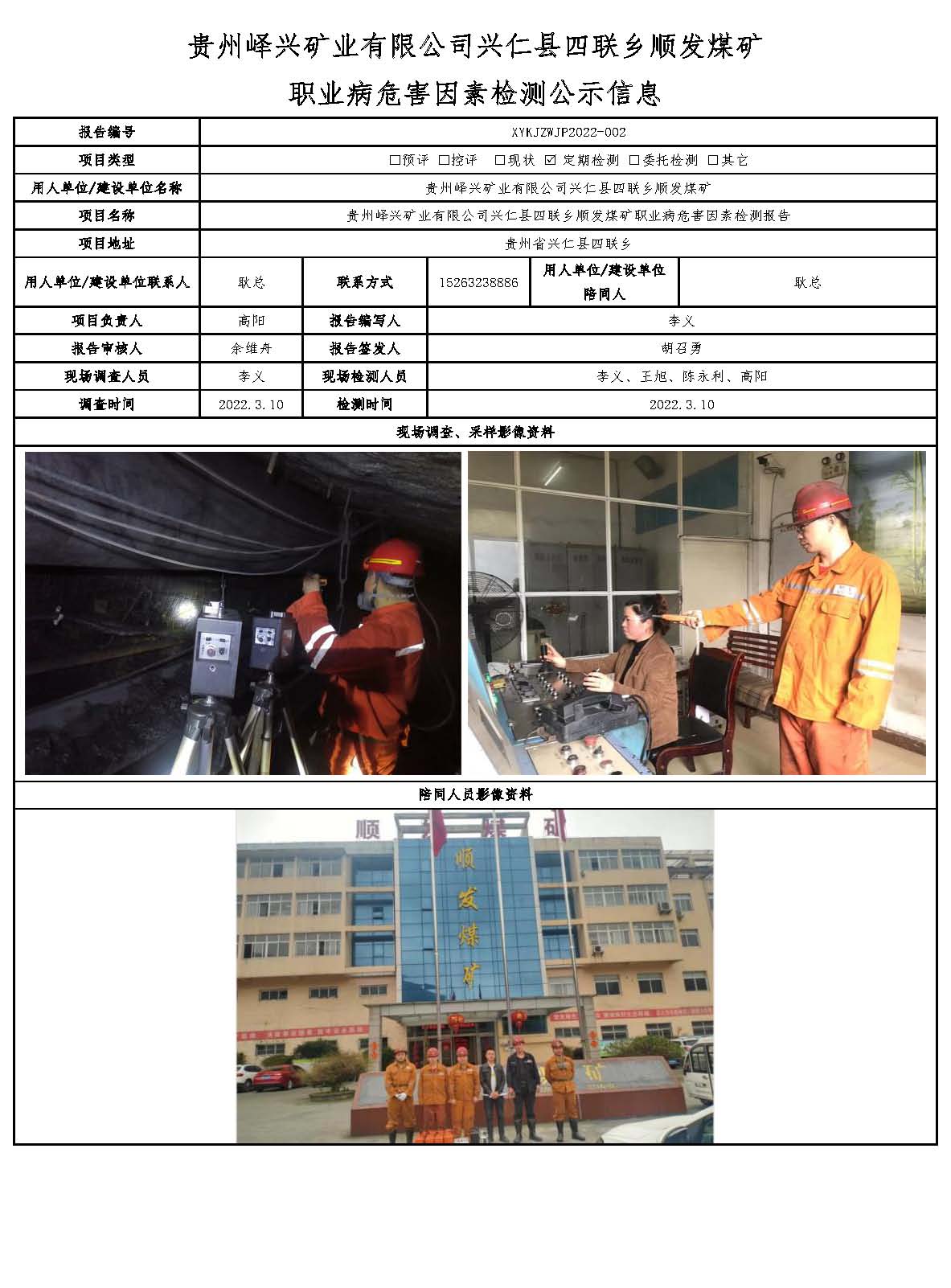 貴州嶧興礦業有限公司興仁縣四聯鄉順發煤礦職業病危害因素檢測公示信息