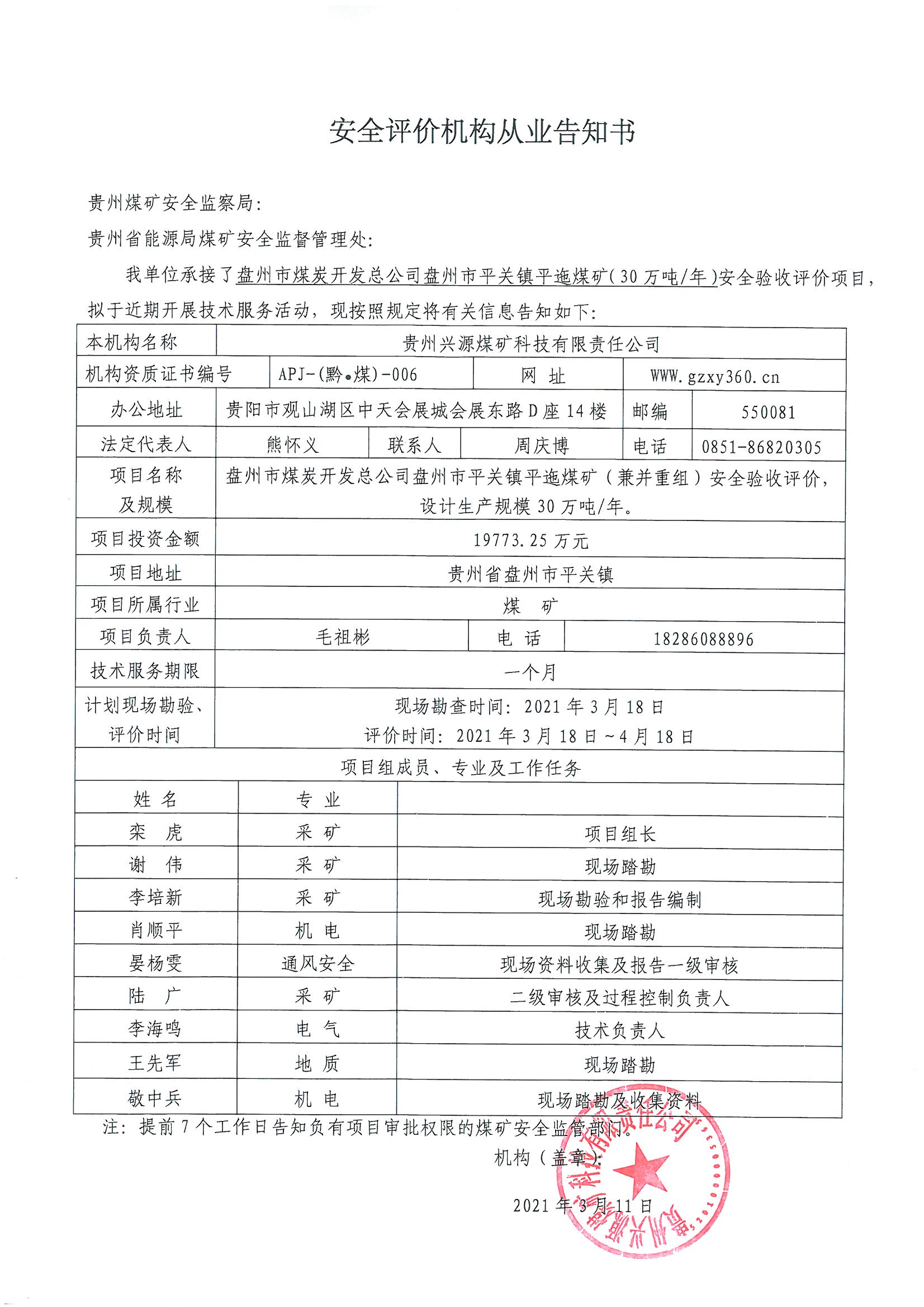 貴州泰昌安能源集團礦業有限公司興仁縣新龍場鎮桂興煤礦安全驗收評價網上公開信息表