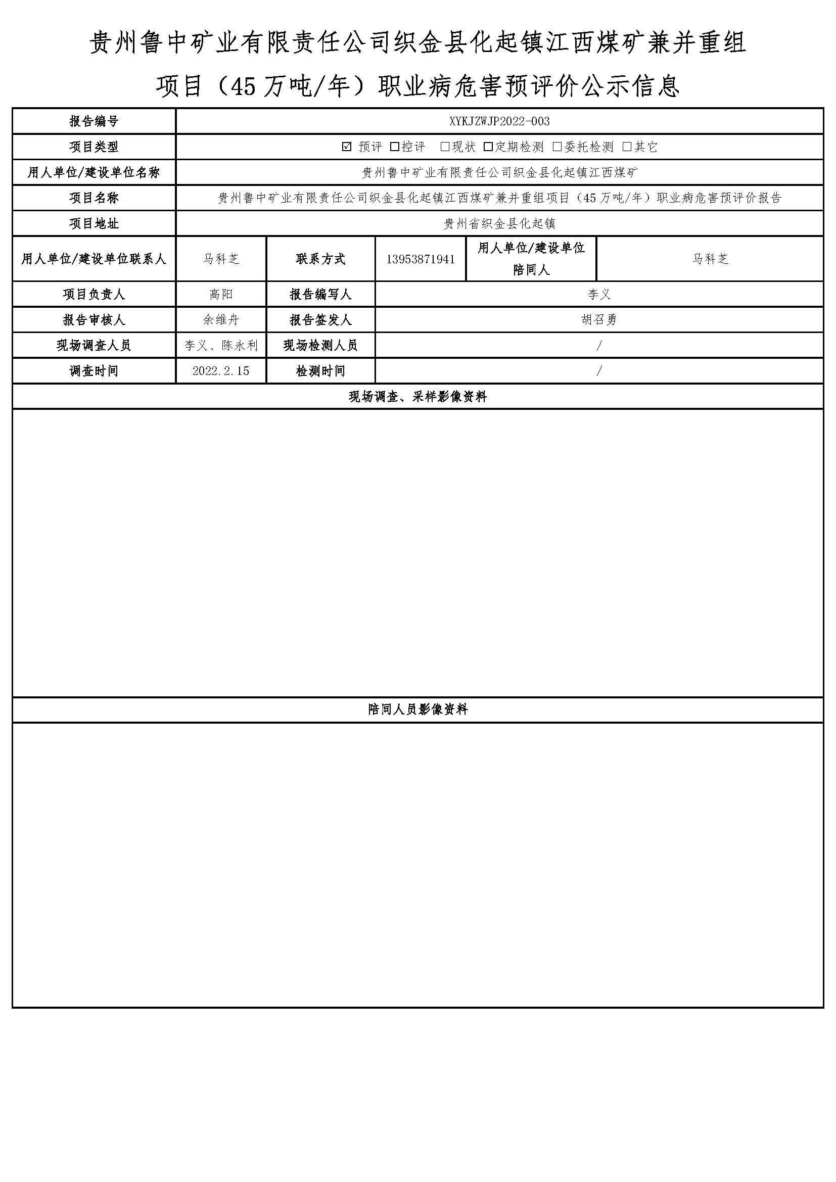 貴州魯中礦業有限責任公司織金縣化起鎮江西煤礦兼并重組項目職業病危害預評價公示信息