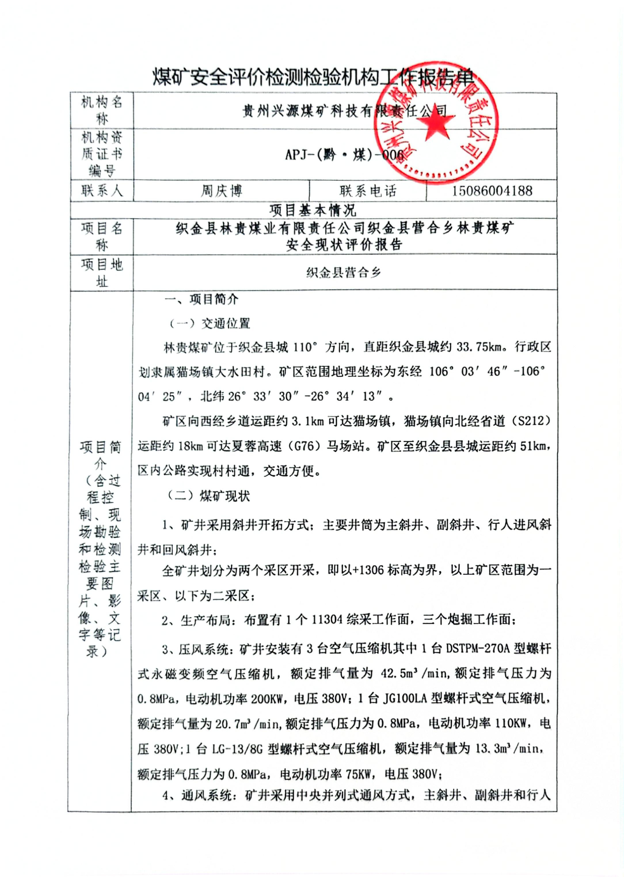 煤礦安全評價檢測檢驗機構(gòu)工作報告單【織金縣林貴煤業(yè)有限責任公司織金縣營合鄉(xiāng)林貴煤礦 安全現(xiàn)狀評價報告】