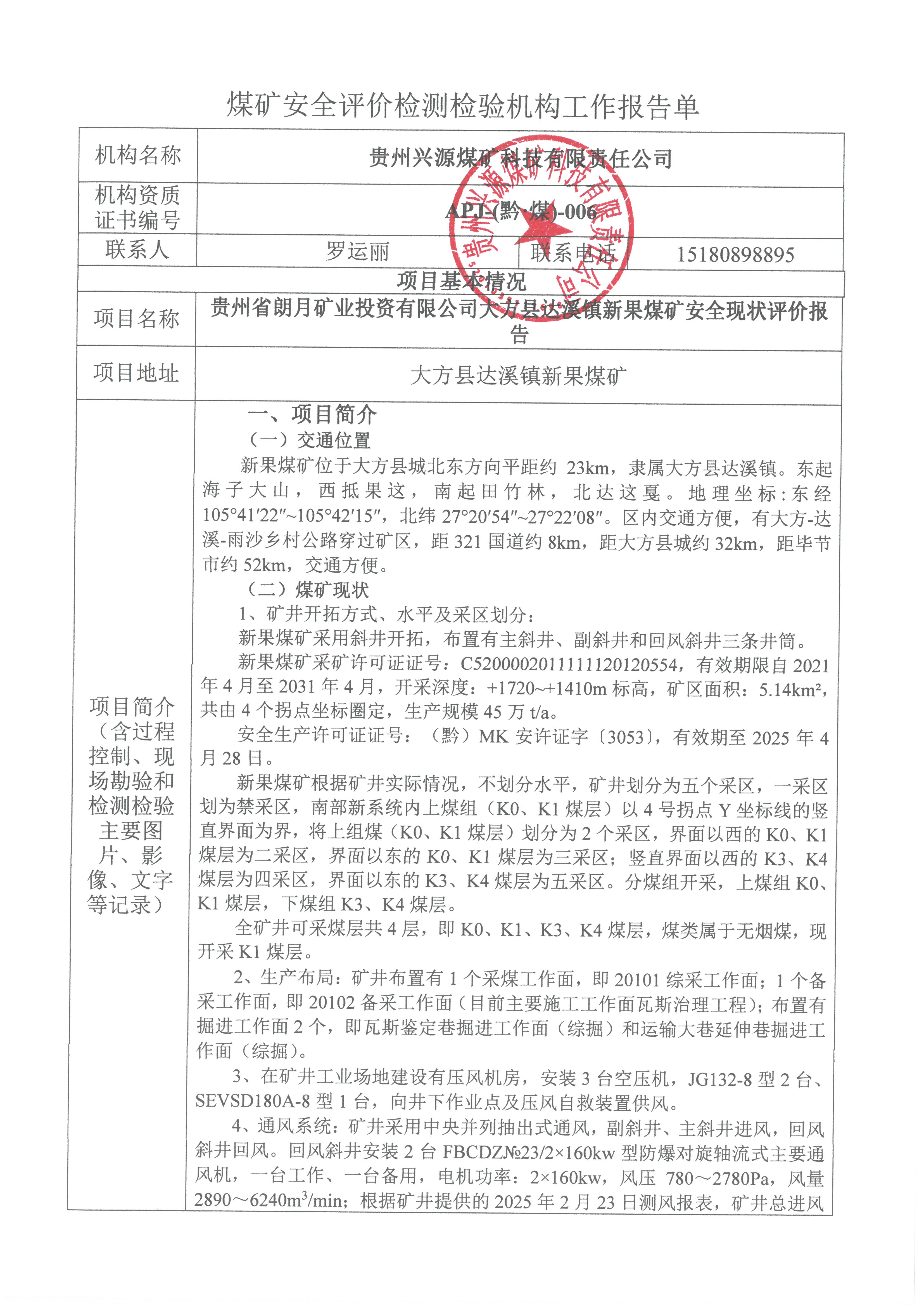 煤礦安全評價檢測檢驗機構(gòu)工作報告單【貴州省朗月礦業(yè)投資有限公司大方縣達溪鎮(zhèn)新果煤礦安全現(xiàn)狀評價報告】