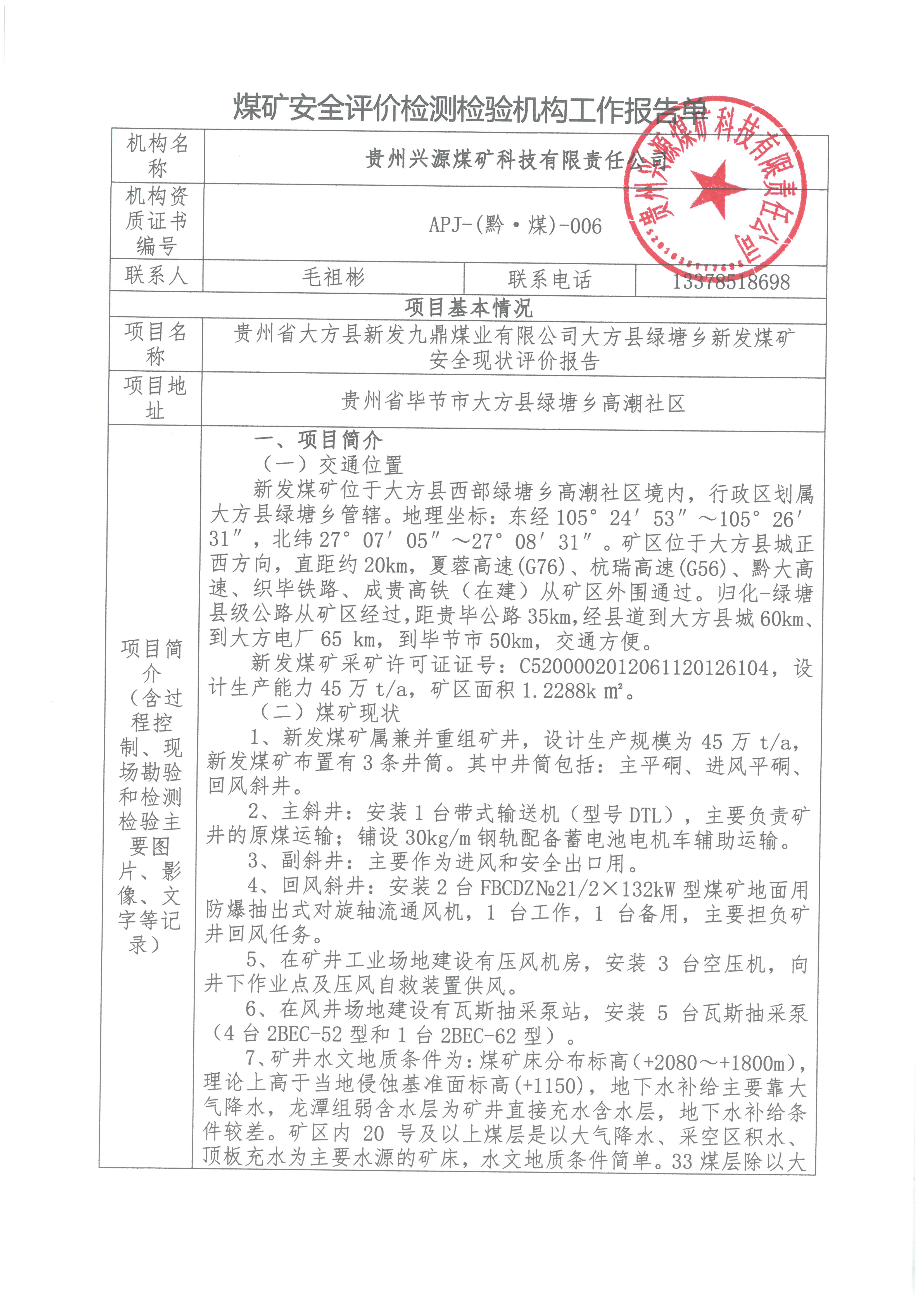 煤礦安全評價檢測檢驗機(jī)構(gòu)工作報告單【貴州省大方縣新發(fā)九鼎煤業(yè)有限公司大方縣綠塘鄉(xiāng)新發(fā)煤礦 安全現(xiàn)狀評價報告】