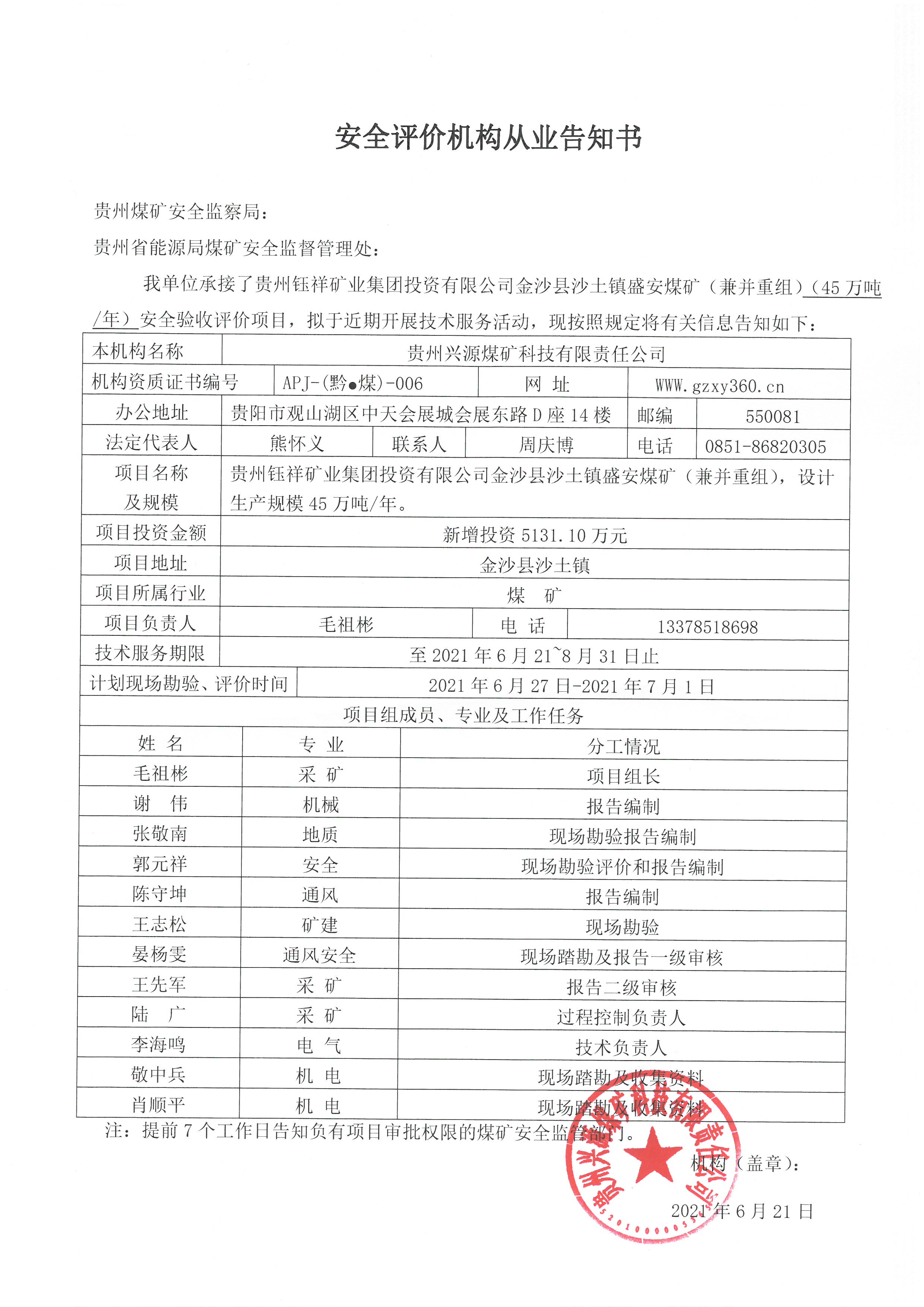 安全評價機構從業(yè)告知書(貴州鈺祥礦業(yè)集團投資有限公司金沙縣沙土鎮(zhèn)盛安煤礦(兼并重組)(45萬噸年)安全驗收評價)