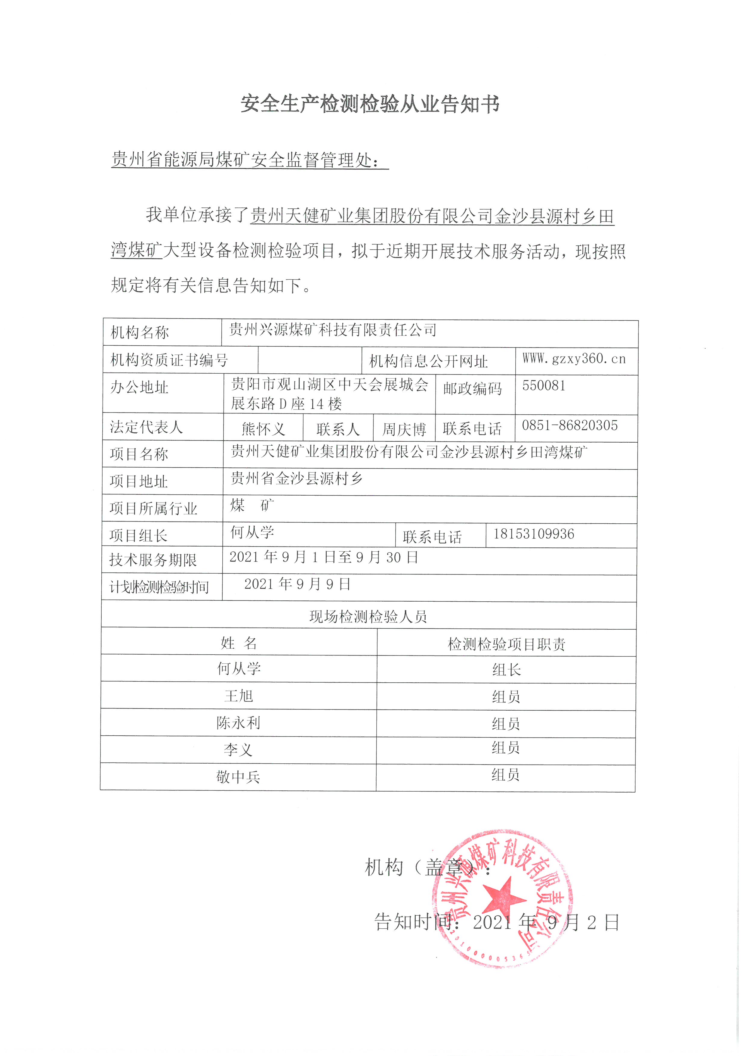 安全生產(chǎn)檢測檢驗從業(yè)告知書【貴州天健礦業(yè)集團股份有限公司金沙縣源村鄉(xiāng)田灣煤礦】