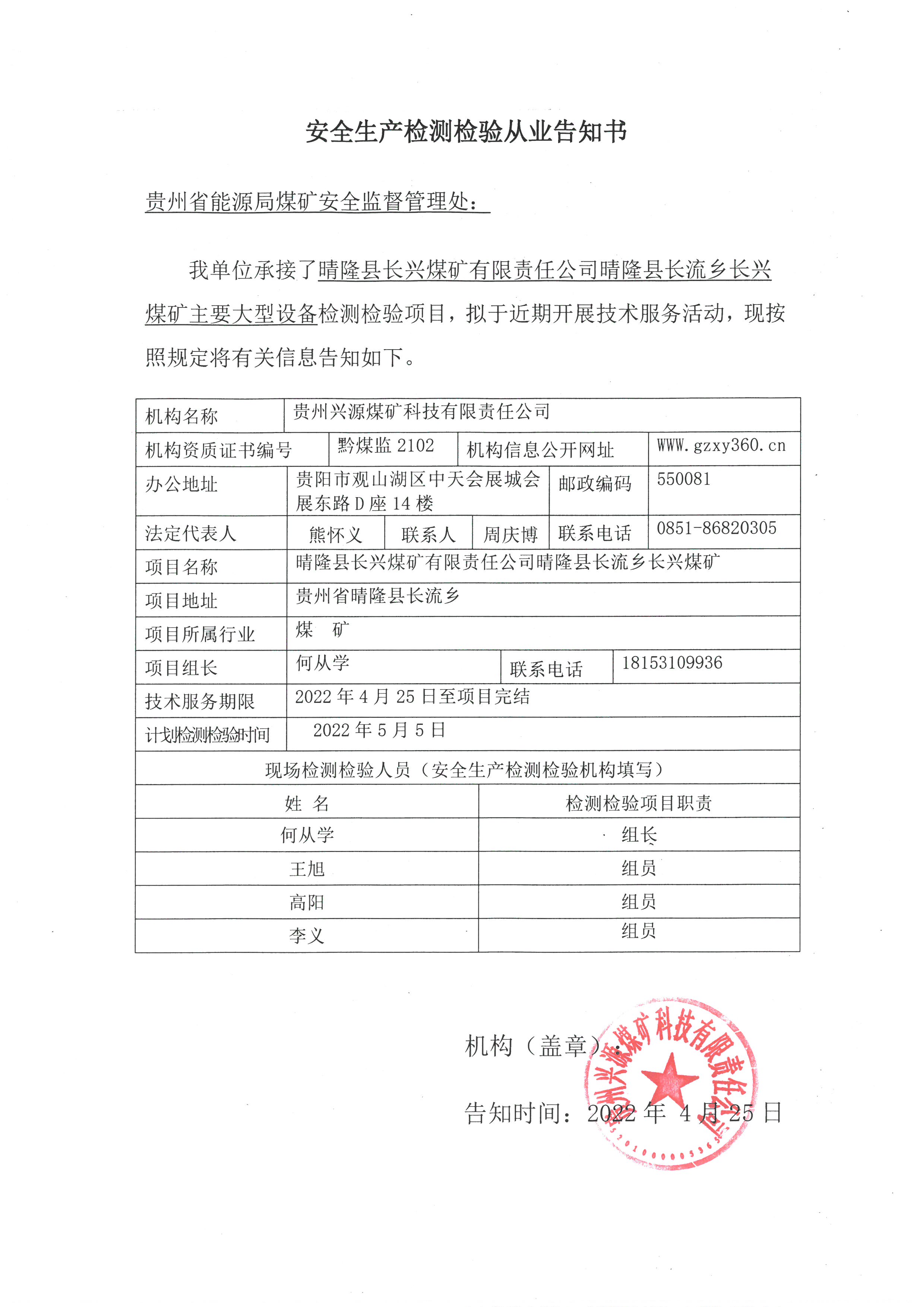 安全生產(chǎn)檢測檢驗從業(yè)告知書【晴隆縣長興煤礦有限責任公司晴隆縣長流鄉(xiāng)長興煤】