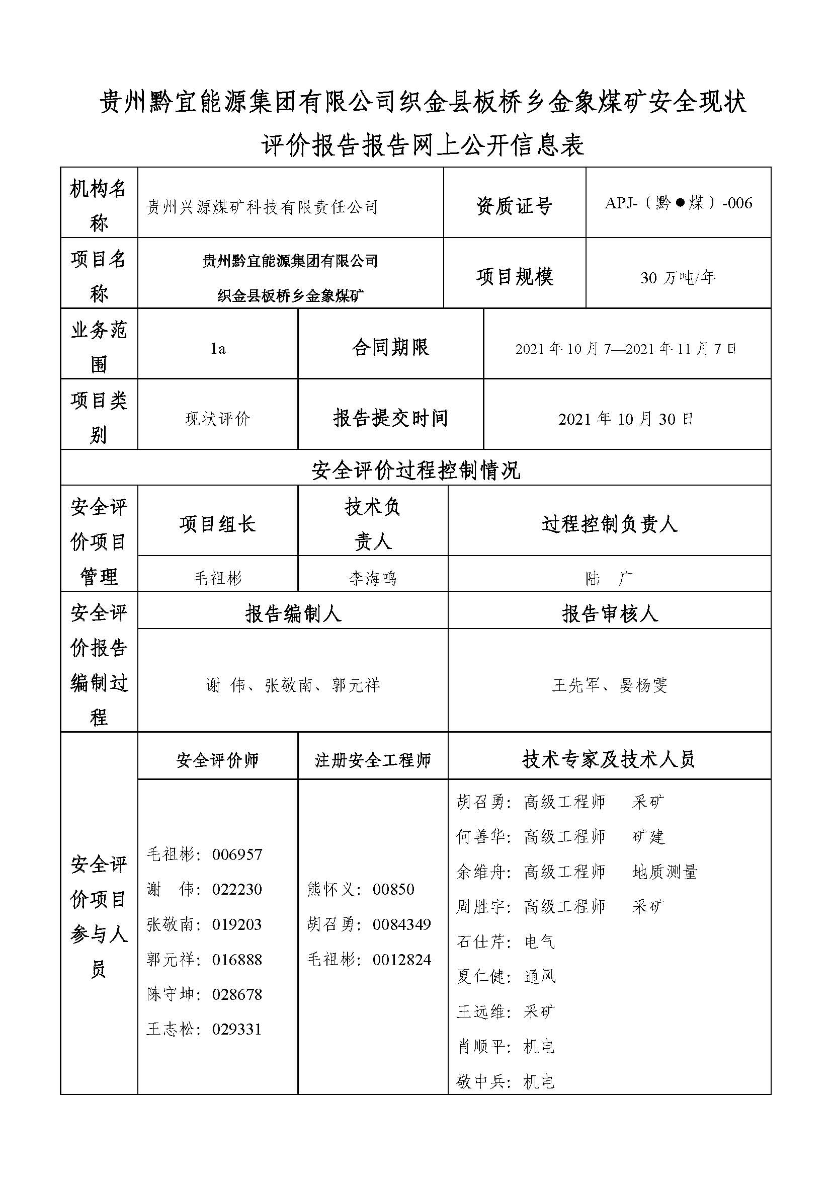 貴州黔宜能源集團(tuán)有限公司織金縣板橋鄉(xiāng)金象煤礦安全現(xiàn)狀評(píng)價(jià)報(bào)告報(bào)告網(wǎng)上公開(kāi)信息表