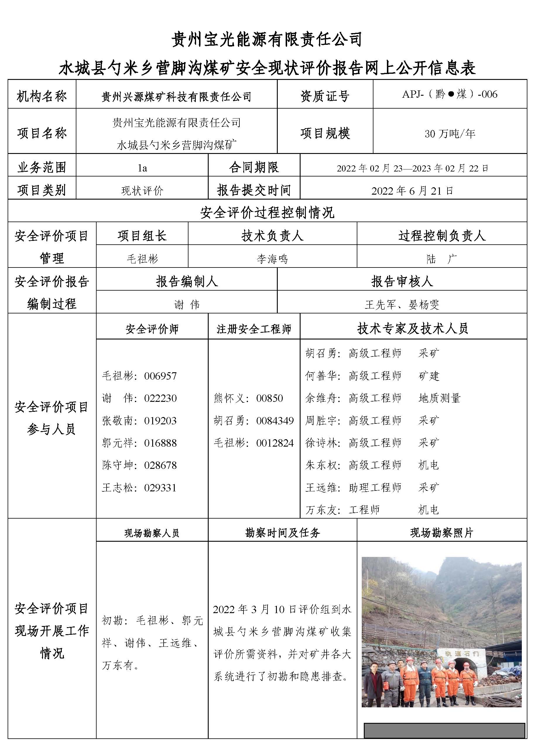 貴州寶光能源有限責(zé)任公司 水城縣勺米鄉(xiāng)營(yíng)腳溝煤礦安全現(xiàn)狀評(píng)價(jià)報(bào)告網(wǎng)上公開(kāi)信息表
