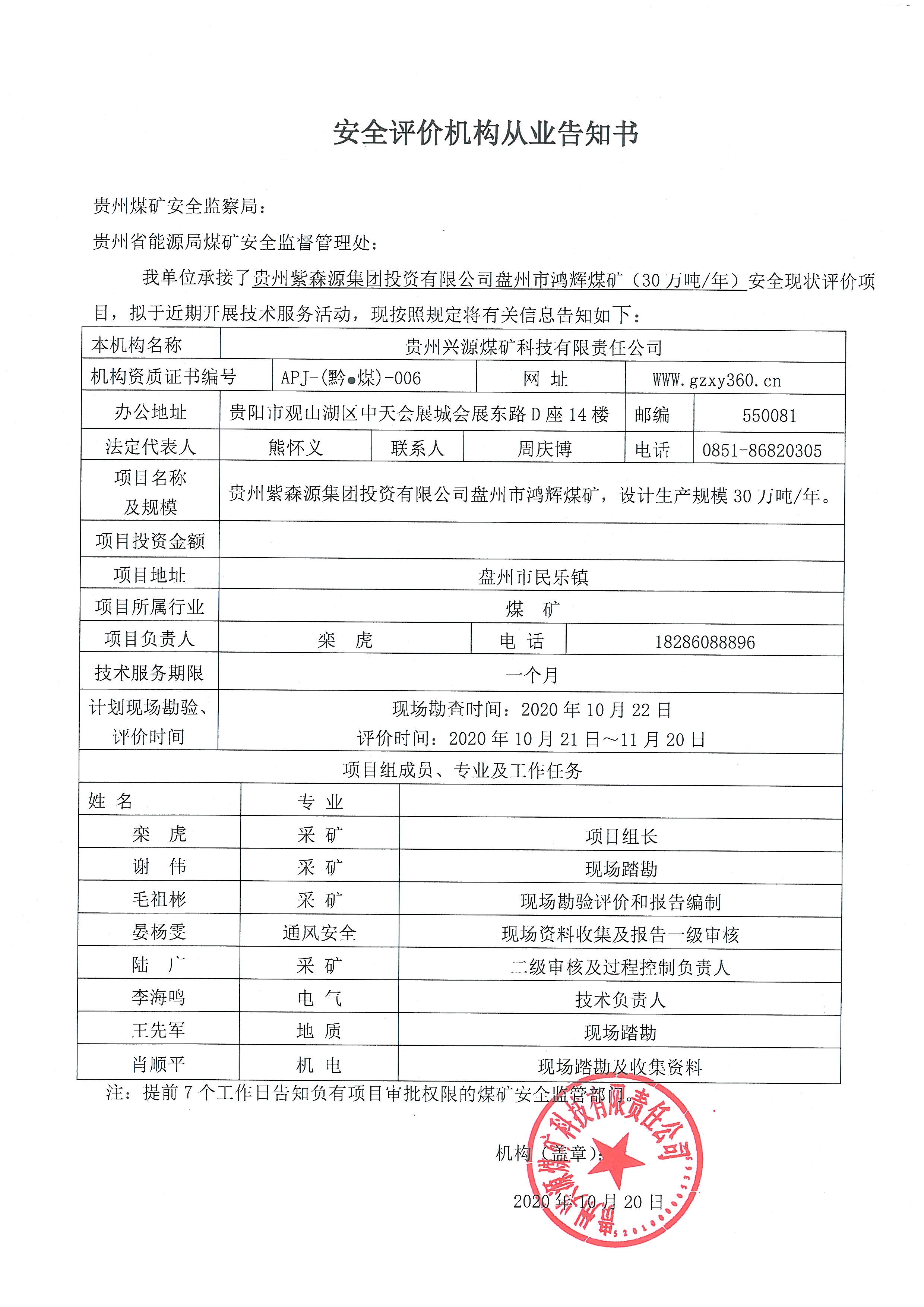 安全評價機構(gòu)從業(yè)告知書(貴州紫森源集團投資有限公司盤州市鴻輝煤礦)