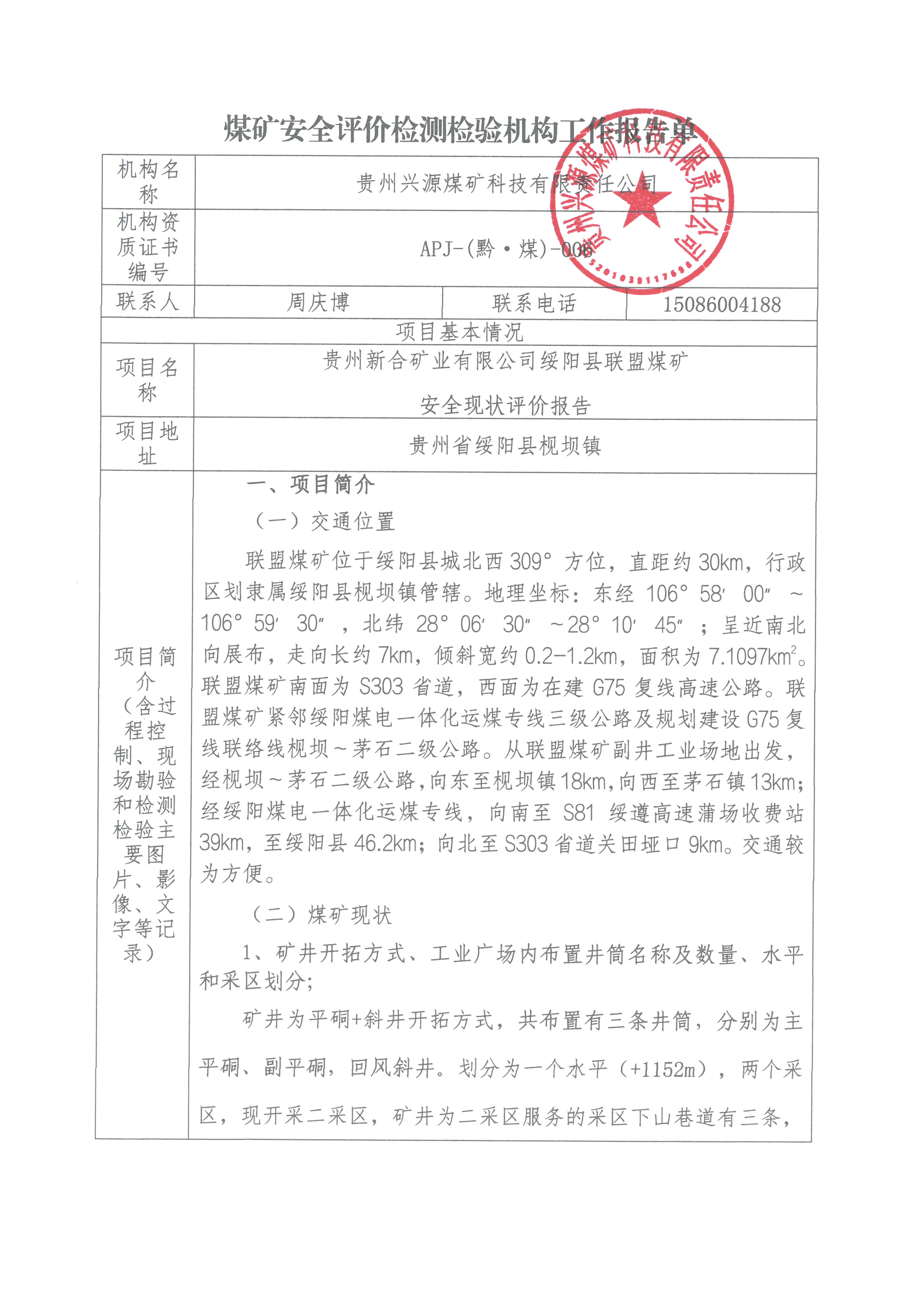煤礦安全評價檢測檢驗機構(gòu)工作報告單【貴州新合礦業(yè)有限公司綏陽縣聯(lián)盟煤礦安全現(xiàn)狀評價報告】