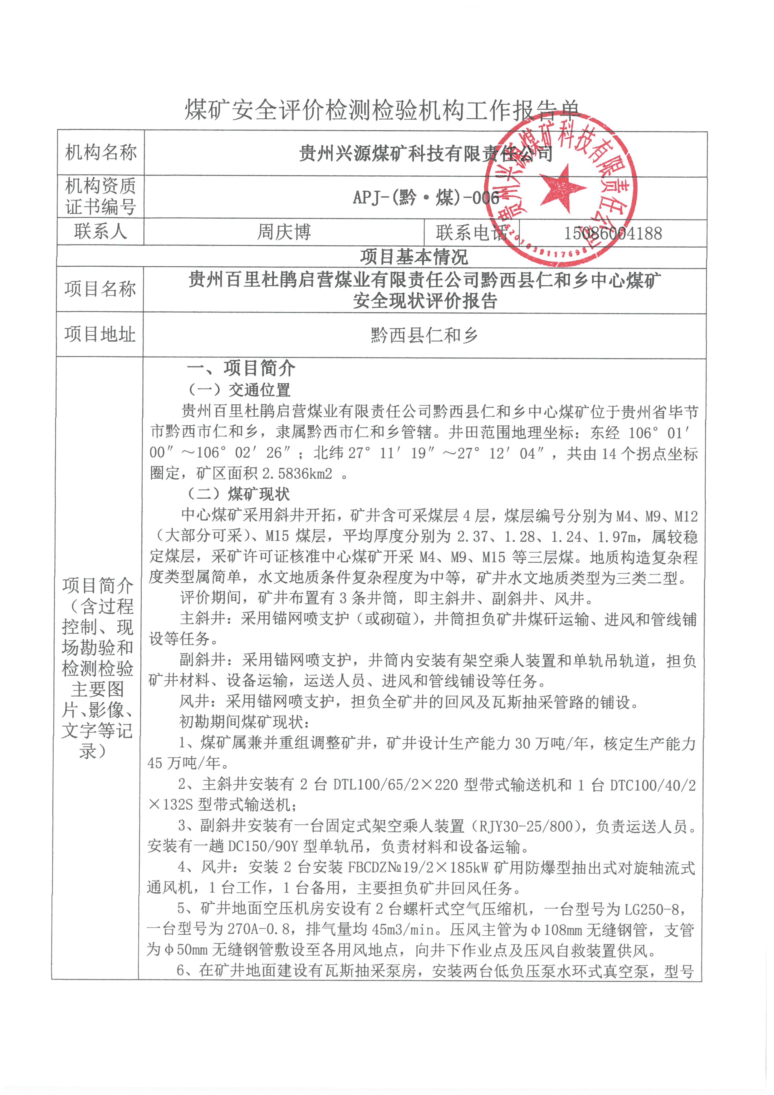 煤礦安全評價檢測檢驗機構工作報告單【貴州百里杜鵑啟營煤業有限責任公司黔西縣仁和鄉中心煤礦安全現狀評價報告】