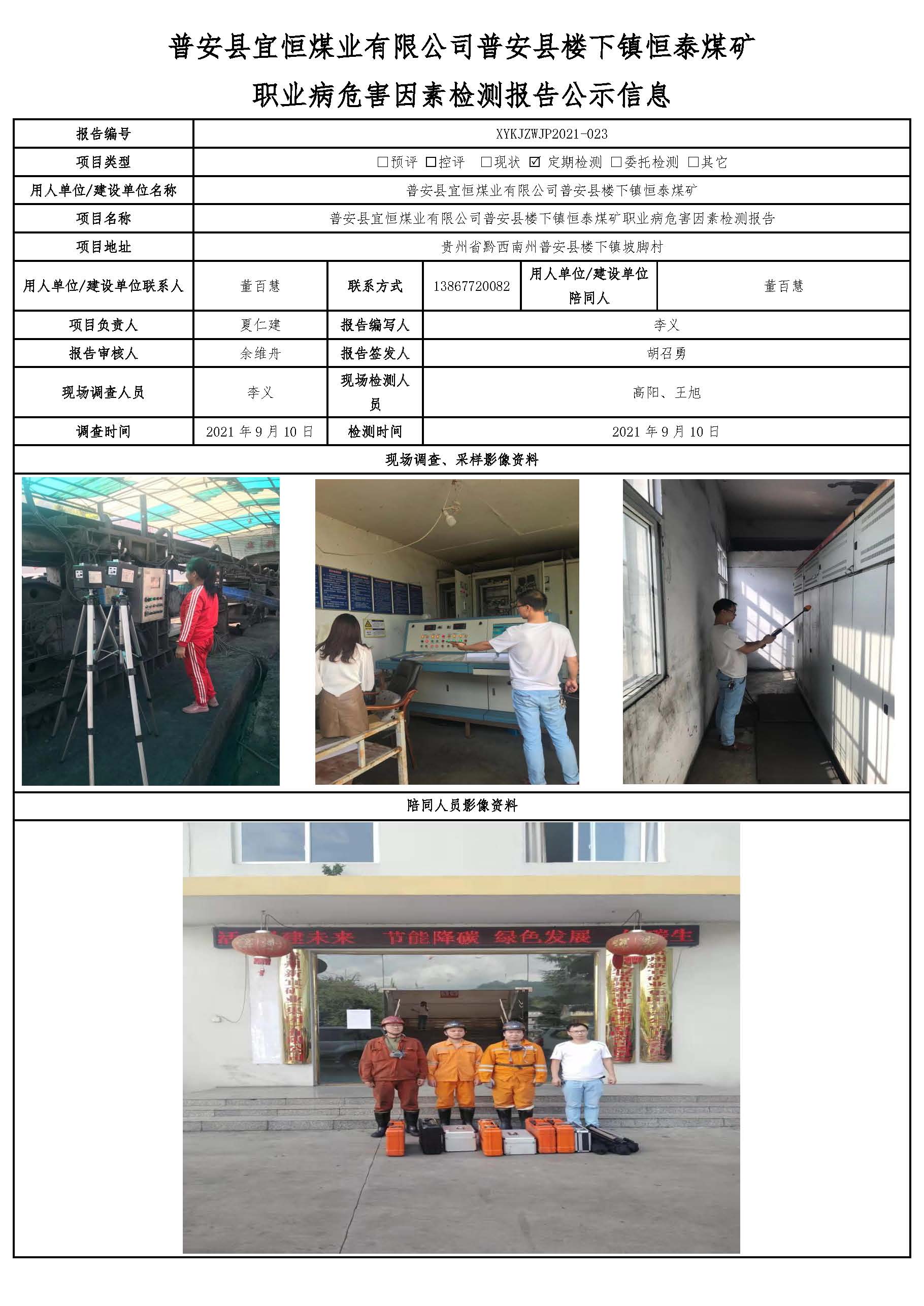 普安縣宜恒煤業有限公司普安縣樓下鎮恒泰煤礦 職業病危害因素檢測報告公示信息