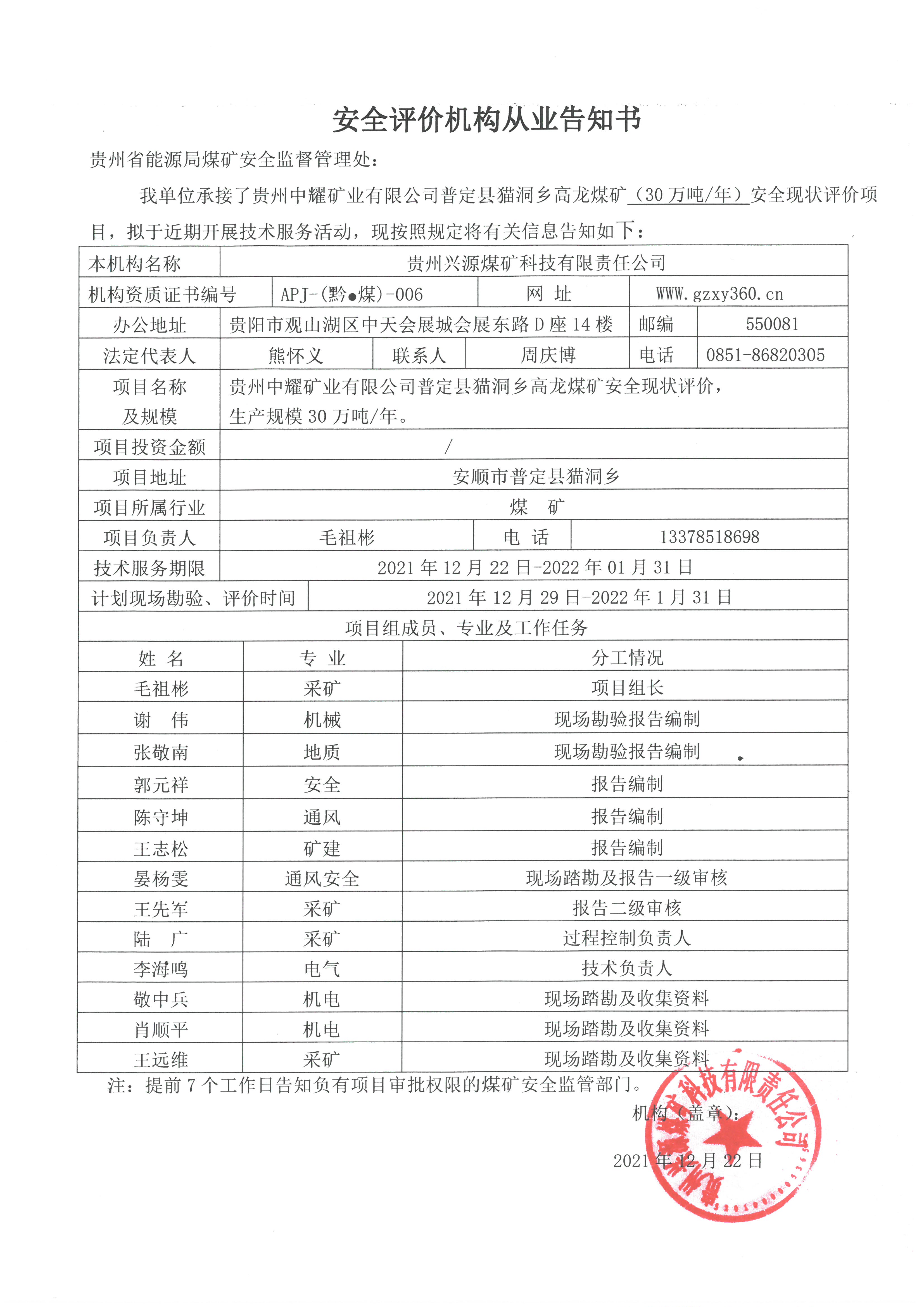 安全評(píng)價(jià)機(jī)構(gòu)從業(yè)告知書(貴州中耀礦業(yè)有限公司普定縣貓洞鄉(xiāng)高龍煤礦(30萬噸年)安全現(xiàn)狀評(píng)價(jià))