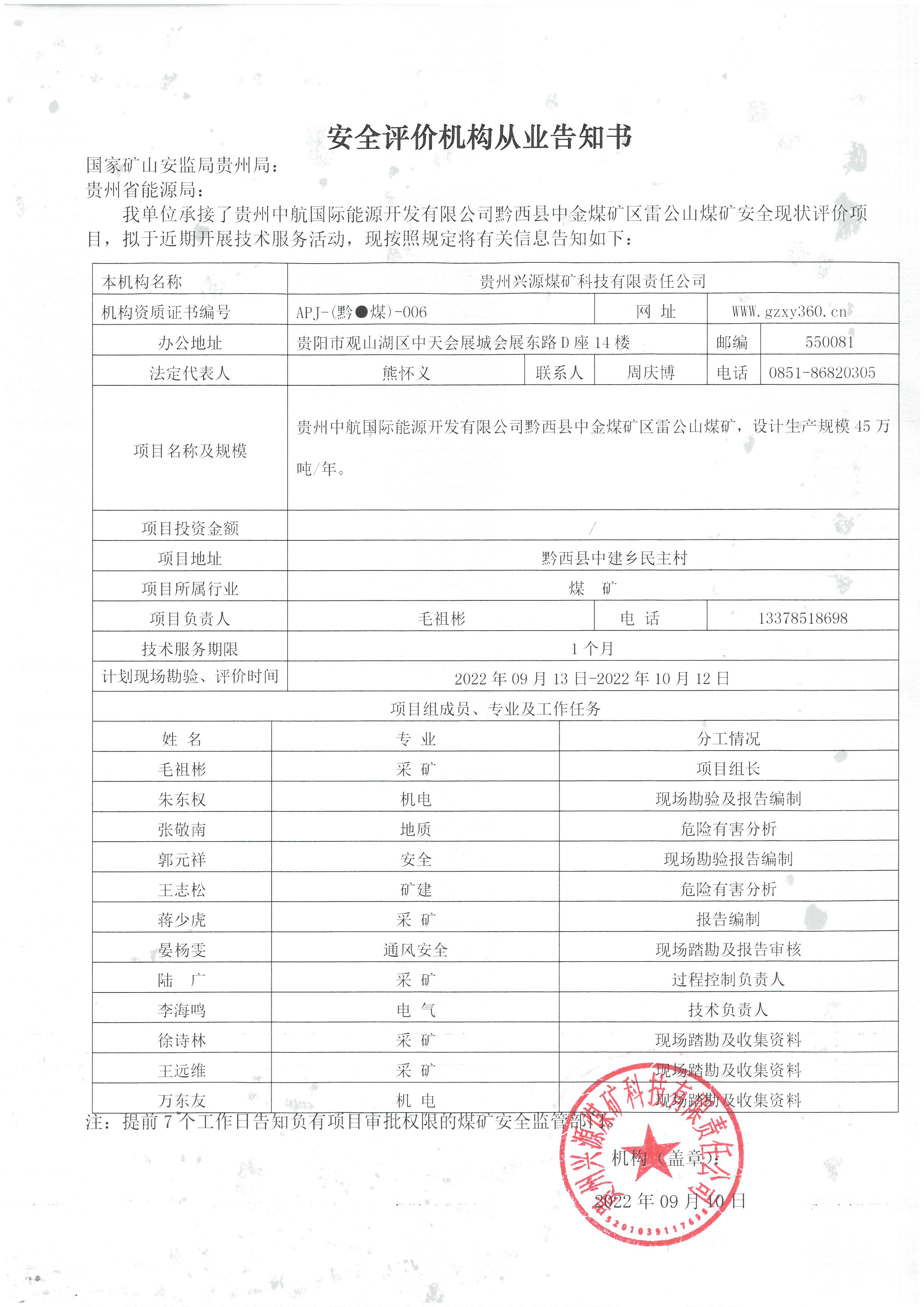 安全評(píng)價(jià)機(jī)構(gòu)從業(yè)告知書(貴州中航國際能源開發(fā)有限公司黔西縣中金煤礦區(qū)雷公山煤礦安全現(xiàn)狀評(píng)價(jià))