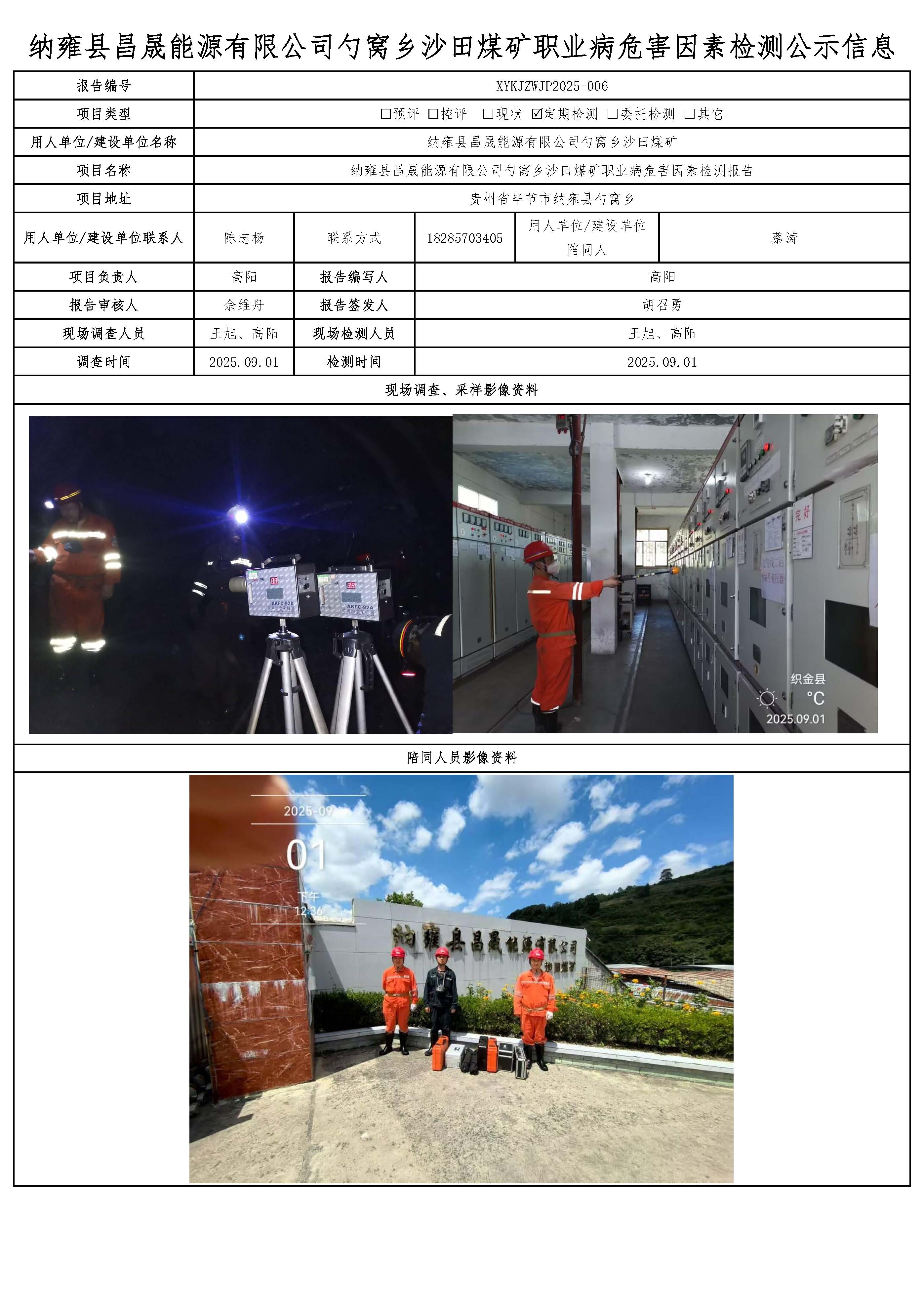 納雍縣昌晟能源有限公司勺窩鄉沙田煤礦職業病危害因素檢測公示信息