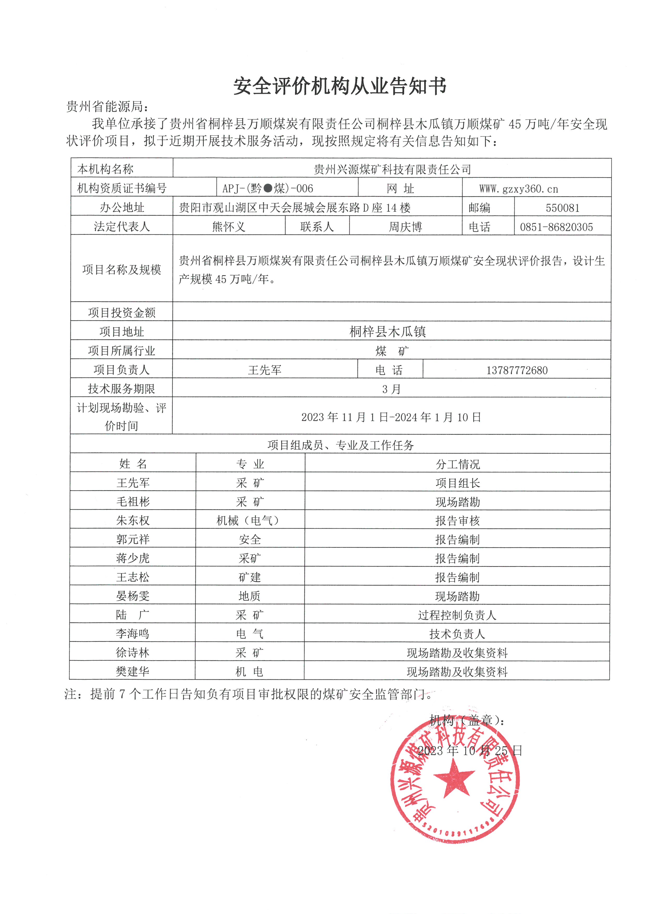 安全評價機構(gòu)從業(yè)告知書【貴州省桐梓縣萬順煤炭有限責(zé)任公司桐梓縣木瓜鎮(zhèn)萬順煤礦】
