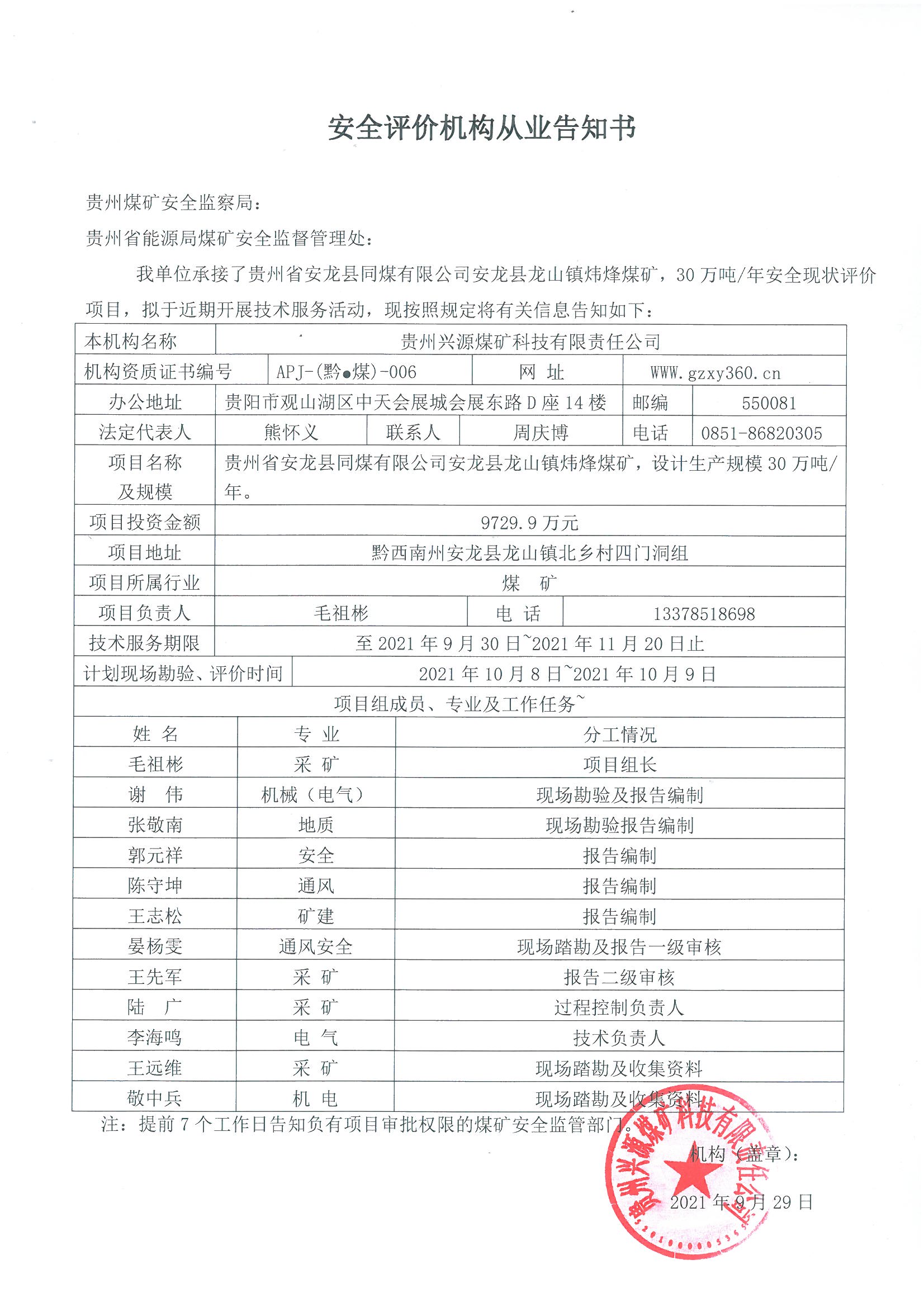安全評(píng)價(jià)機(jī)構(gòu)從業(yè)告知書(貴州省安龍縣同煤有限公司安龍縣龍山鎮(zhèn)煒烽煤礦)