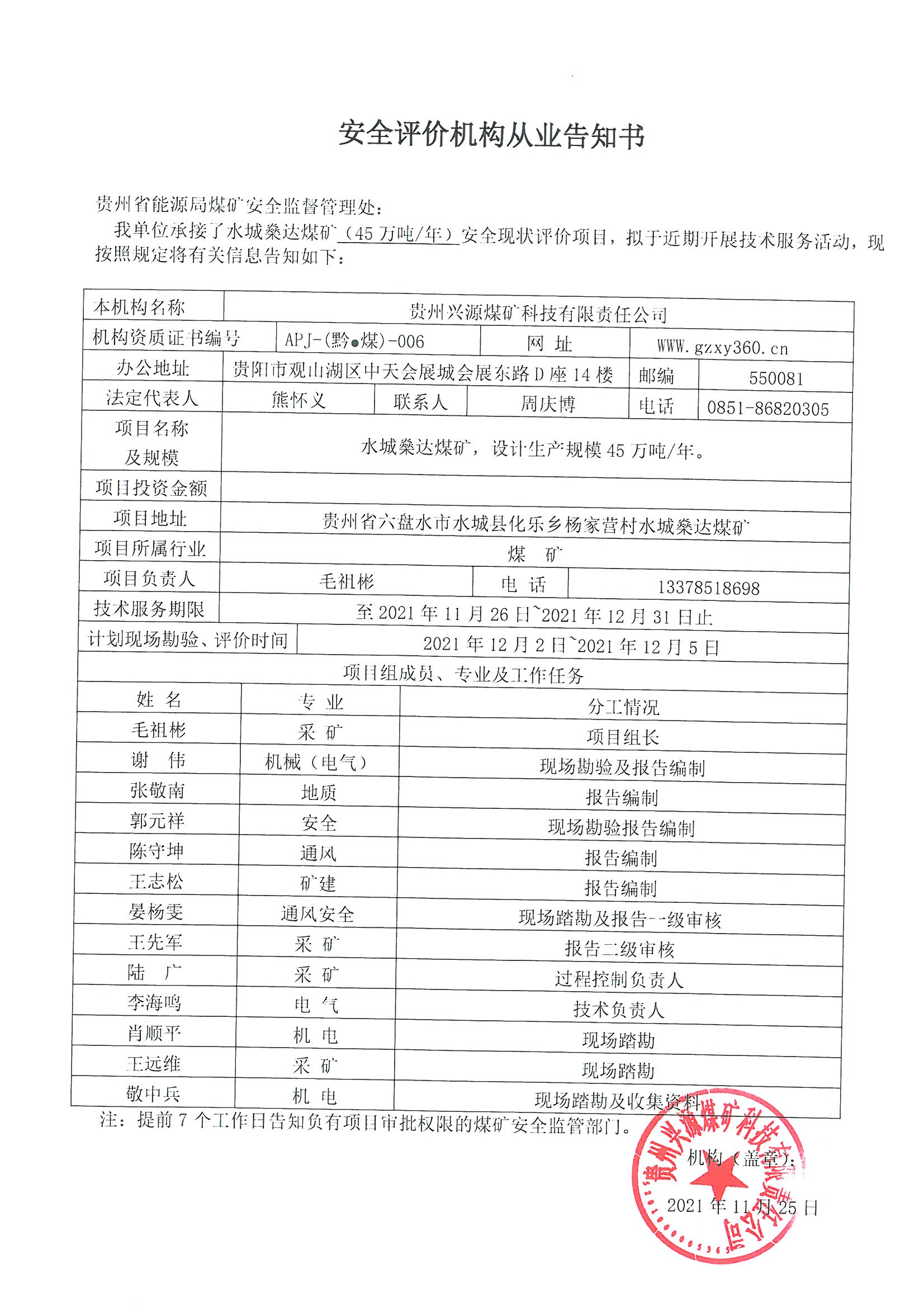安全評(píng)價(jià)機(jī)構(gòu)從業(yè)告知書(水城燊達(dá)煤礦(45萬噸/年)安全現(xiàn)狀評(píng)價(jià))