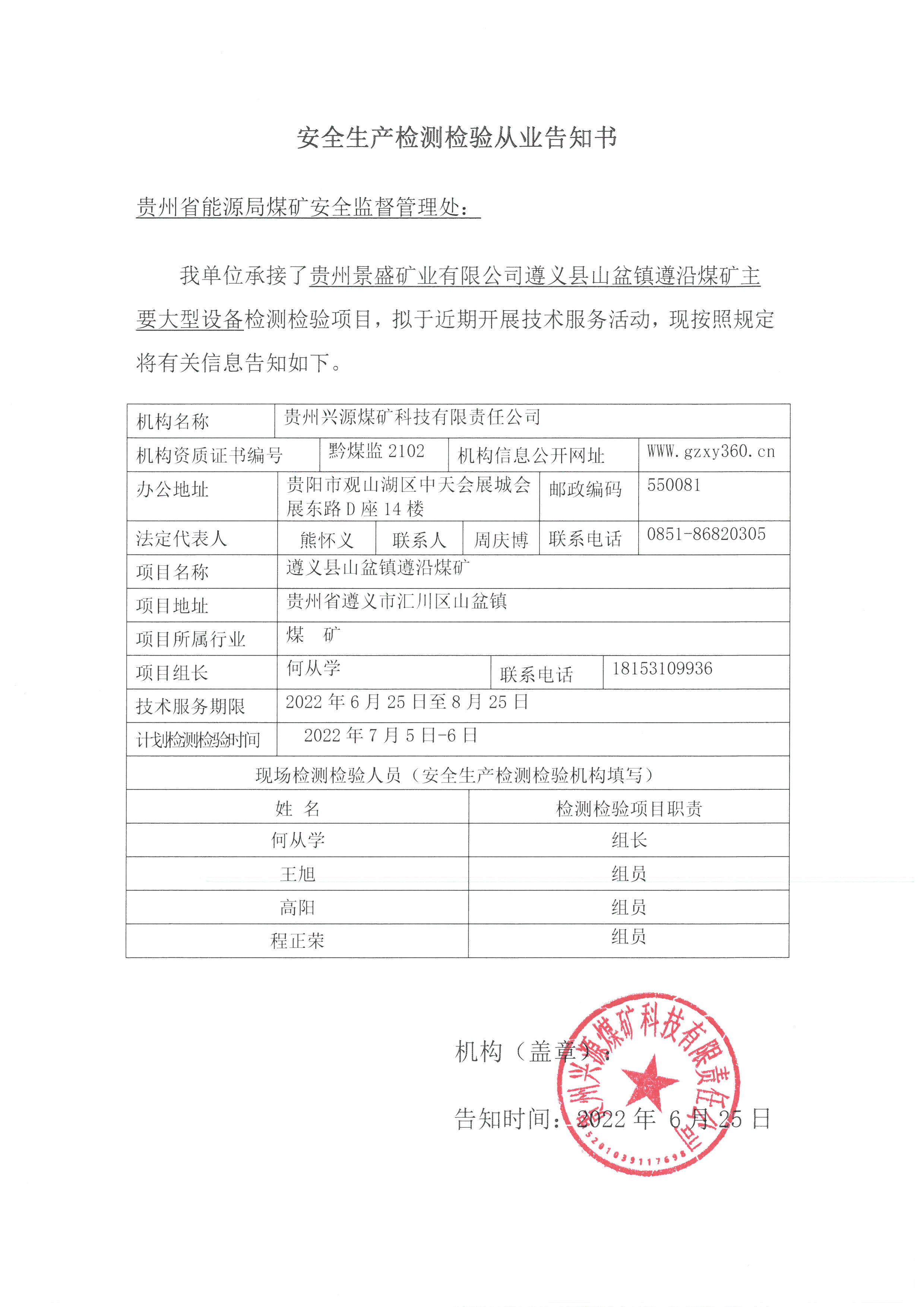 安全生產(chǎn)檢測檢驗(yàn)從業(yè)告知書【貴州景盛礦業(yè)有限公司遵義縣山盆鎮(zhèn)遵沿煤礦主要大型設(shè)備檢測檢驗(yàn)項(xiàng)目】