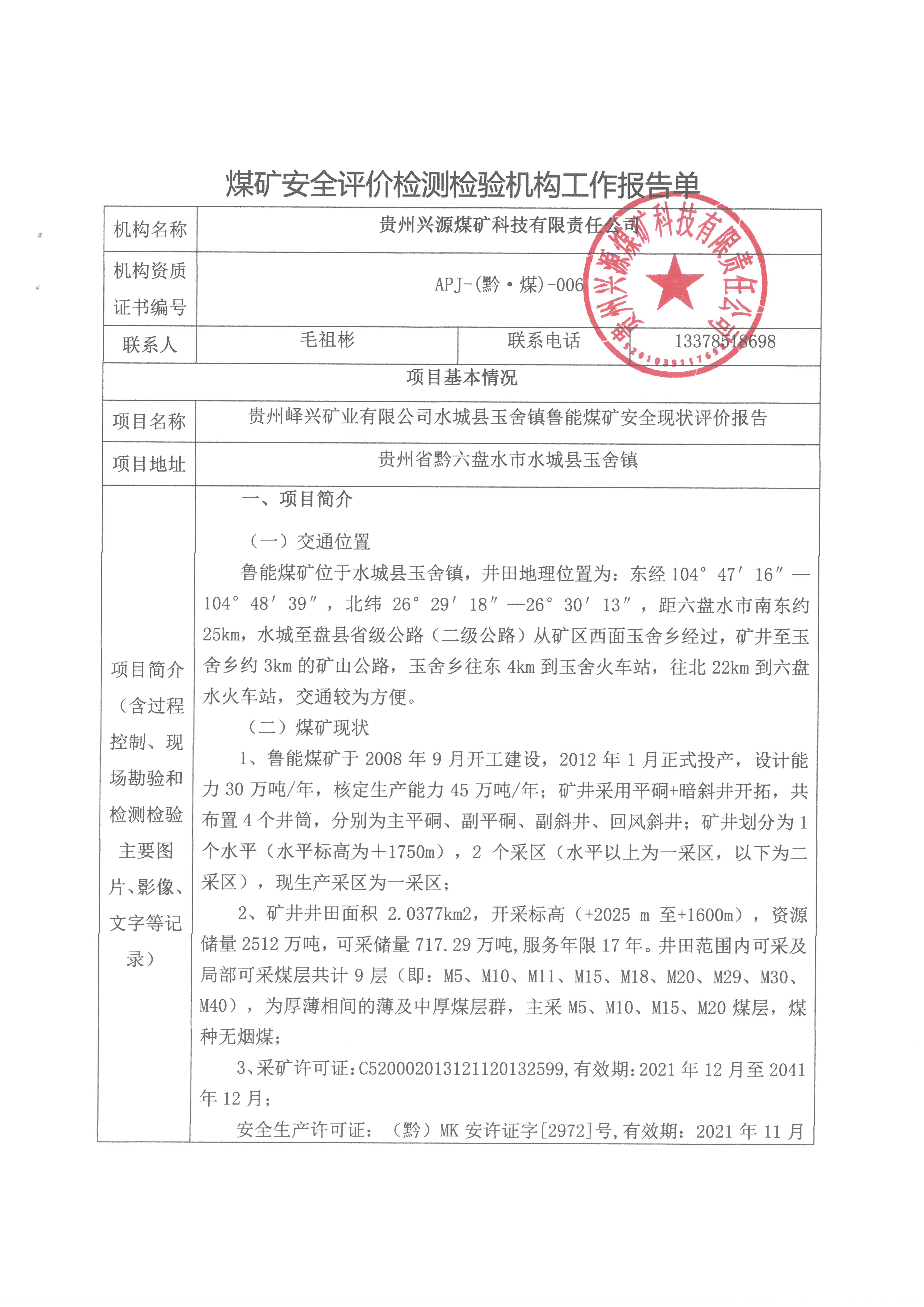 煤礦安全評價檢測檢驗機構工作報告單【貴州嶧興礦業有限公司水城縣玉舍鎮魯能煤礦安全現狀評價報告】