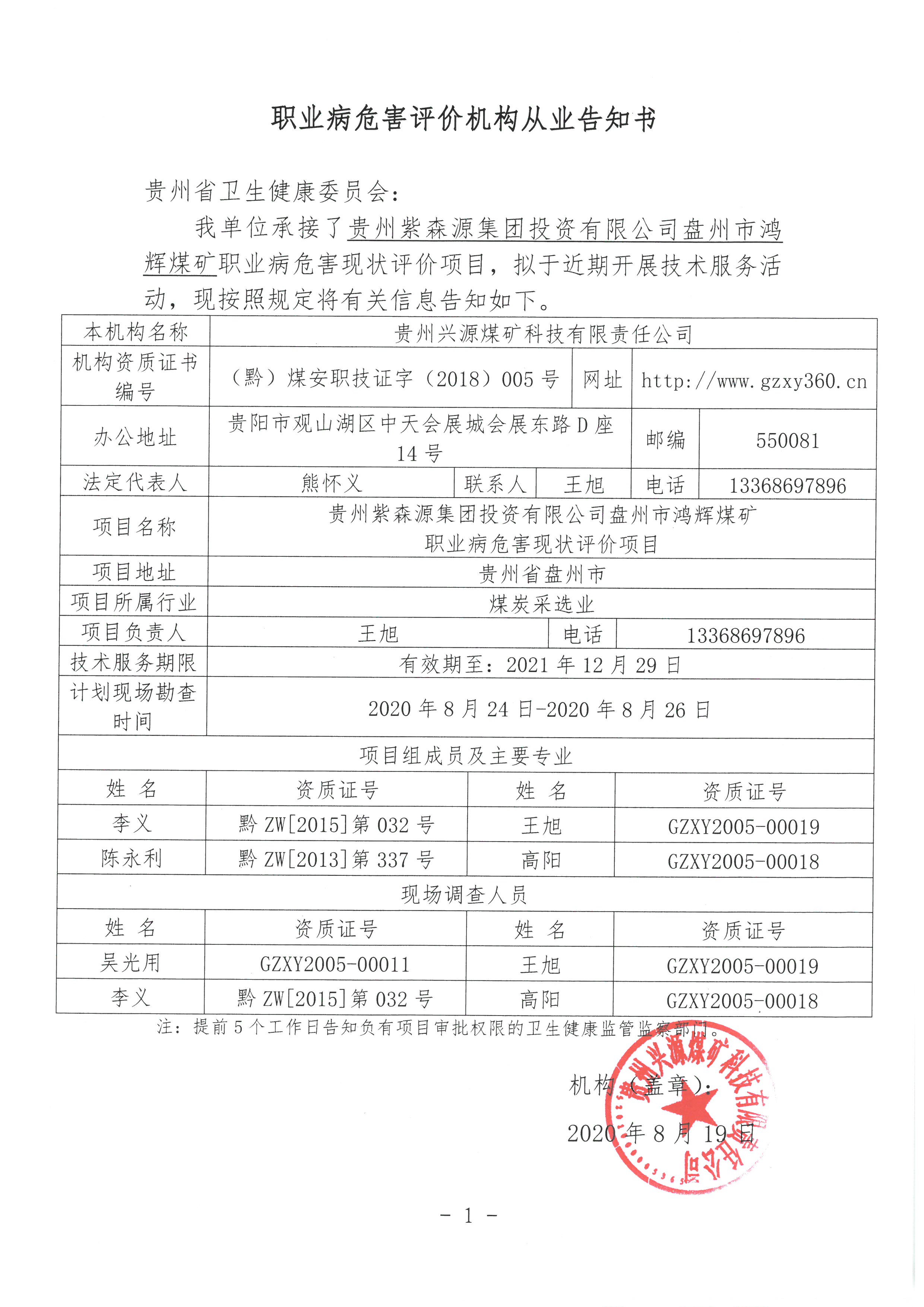 職業(yè)病危害評(píng)價(jià)機(jī)構(gòu)從業(yè)告知書【貴州紫森源集團(tuán)投資有限公司盤州市鴻輝煤礦】