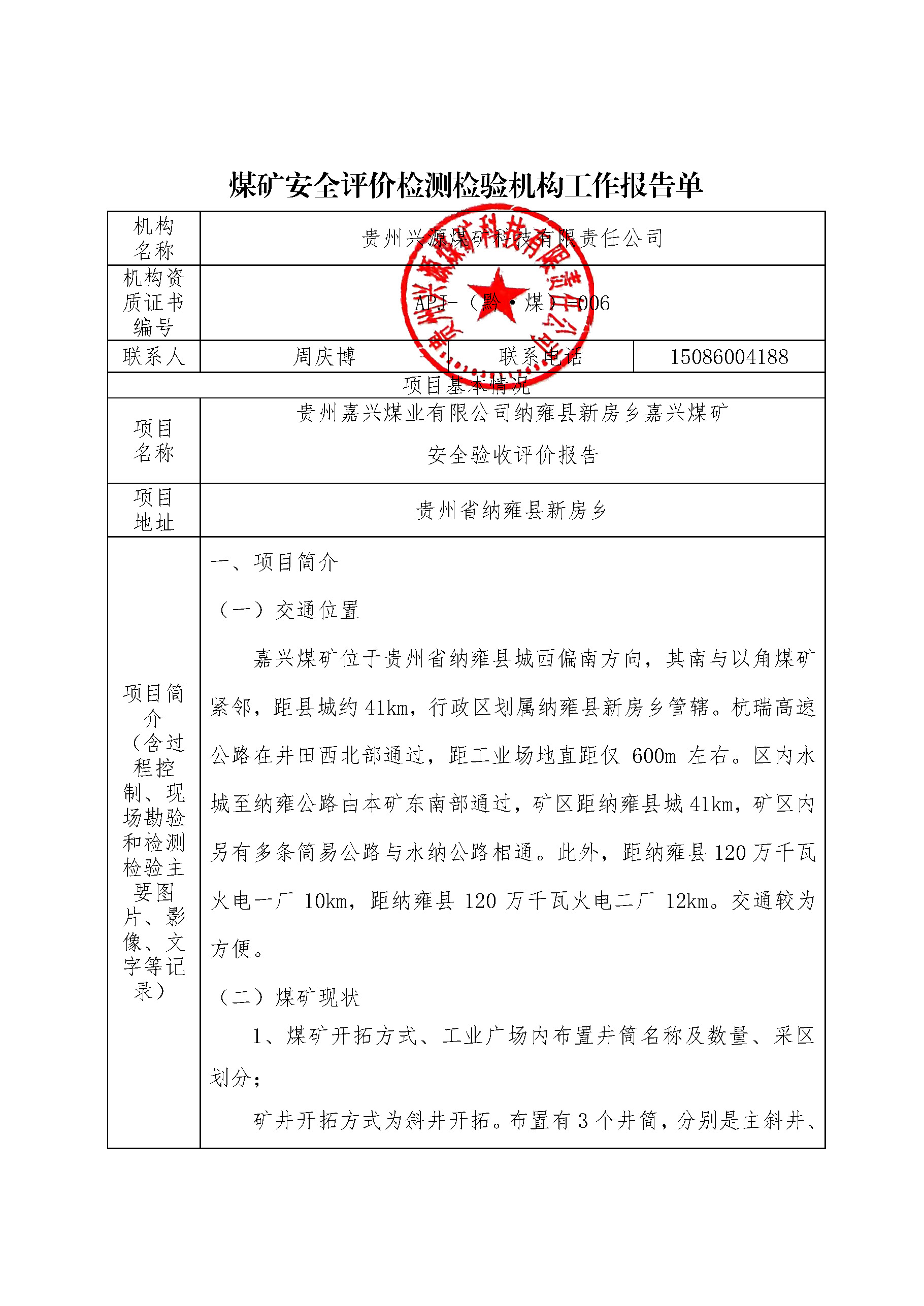 煤礦安全評(píng)價(jià)檢測(cè)檢驗(yàn)機(jī)構(gòu)工作報(bào)告單【貴州嘉興煤業(yè)有限公司納雍縣新房鄉(xiāng)嘉興煤礦安全驗(yàn)收評(píng)價(jià)報(bào)告】