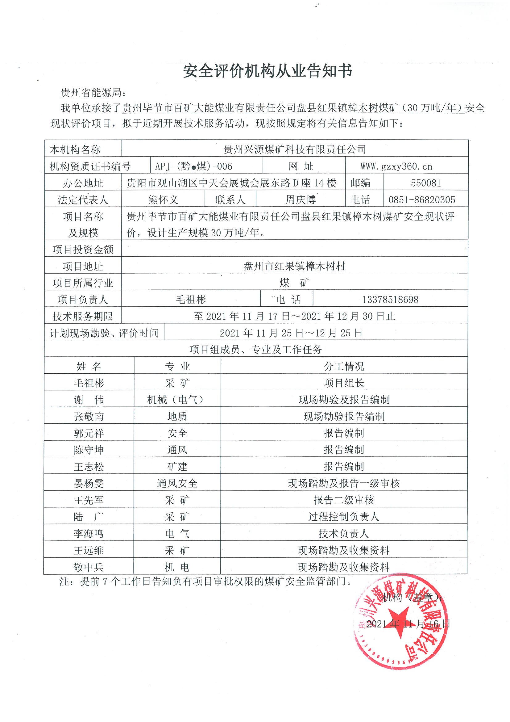 安全評價機構(gòu)從業(yè)告知書(貴州畢節(jié)市百礦大能煤業(yè)有限責(zé)任公司盤縣紅果鎮(zhèn)樟木樹煤礦(30萬噸/年)安全現(xiàn)狀評價)