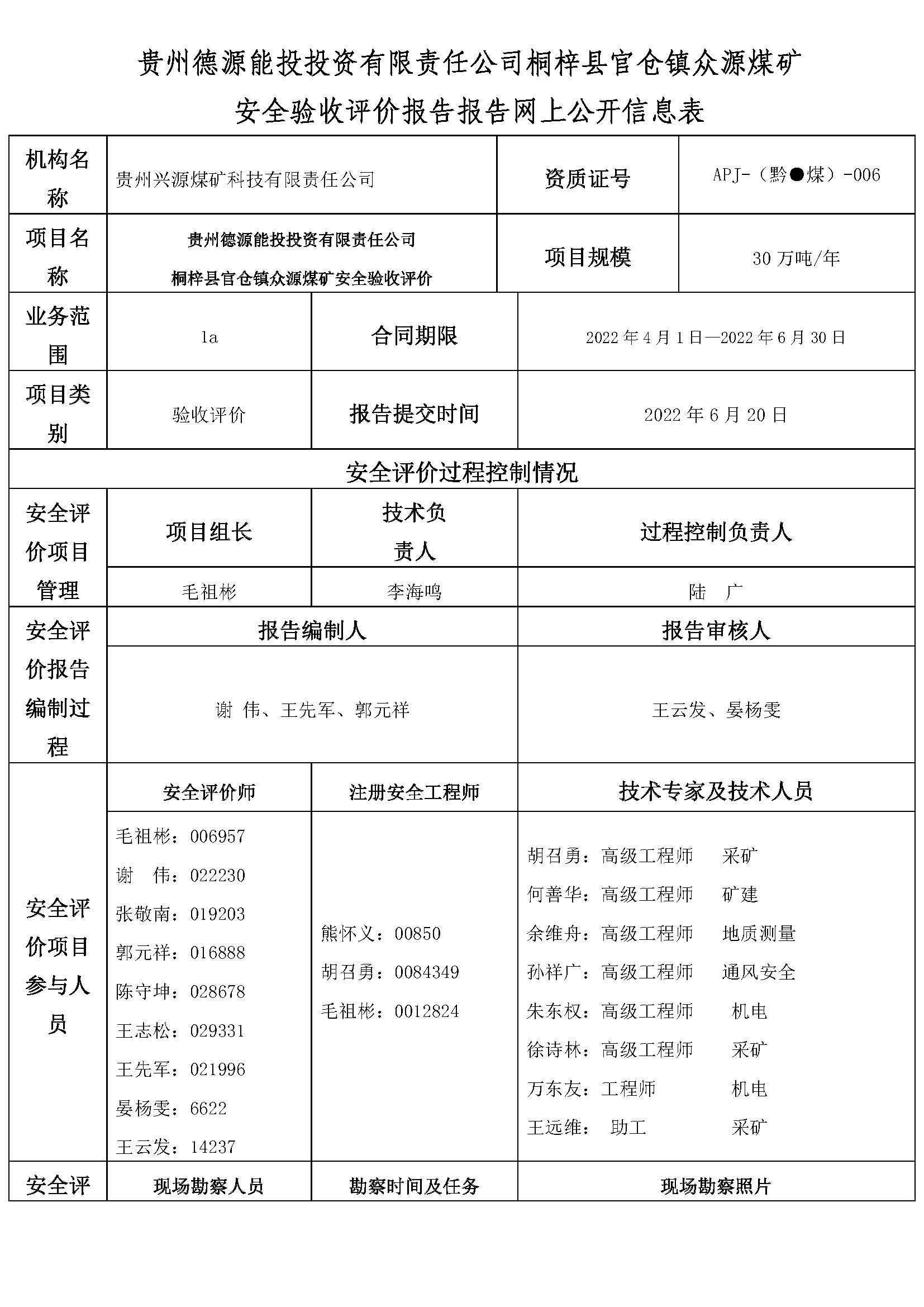 貴州德源能投投資有限責任公司桐梓縣官倉鎮(zhèn)眾源煤礦安全驗收評價報告報告網上公開信息表