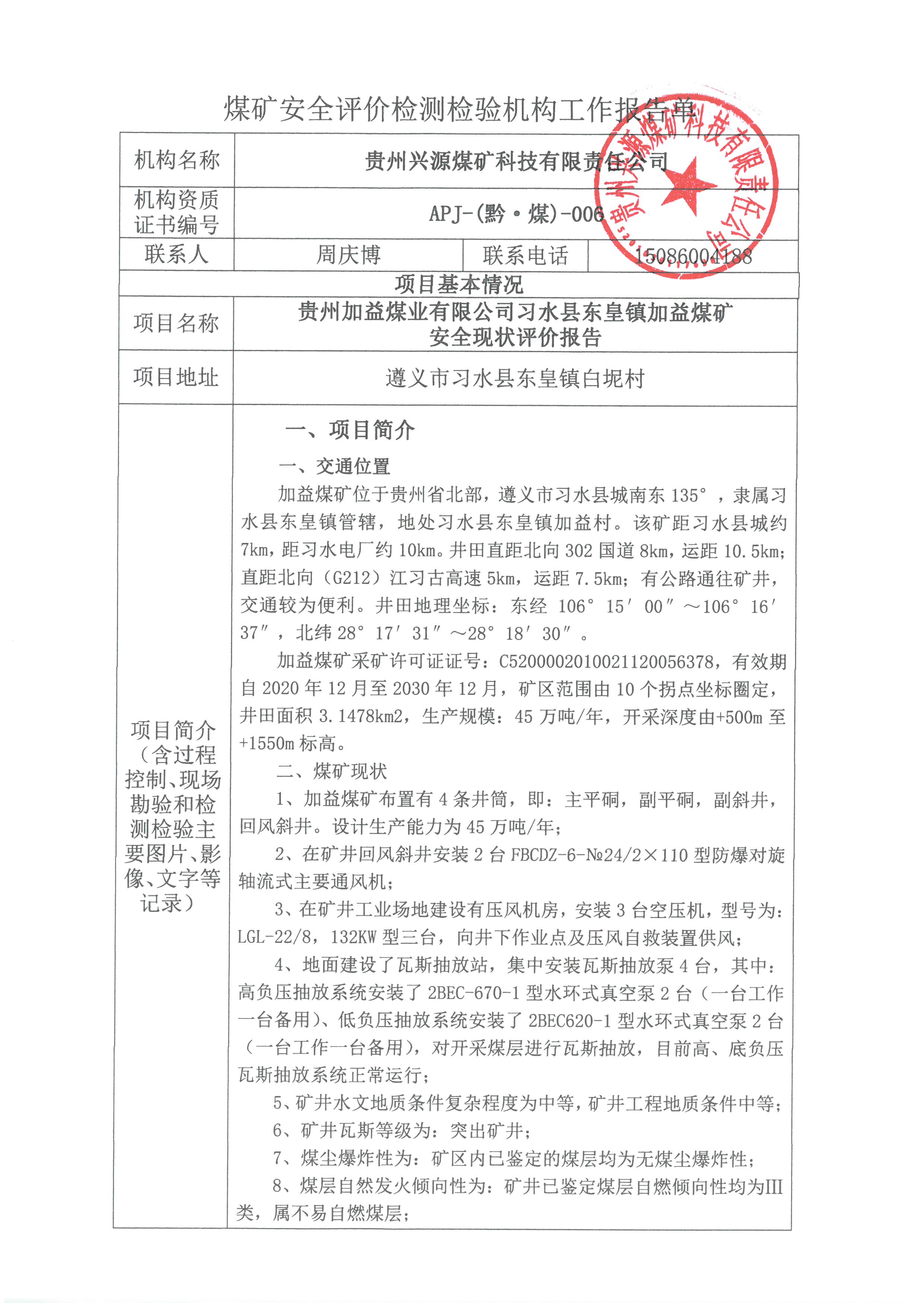 煤礦安全評價檢測檢驗機構工作報告單【貴州加益煤業(yè)有限公司習水縣東皇鎮(zhèn)加益煤礦安全現(xiàn)狀評價報告】