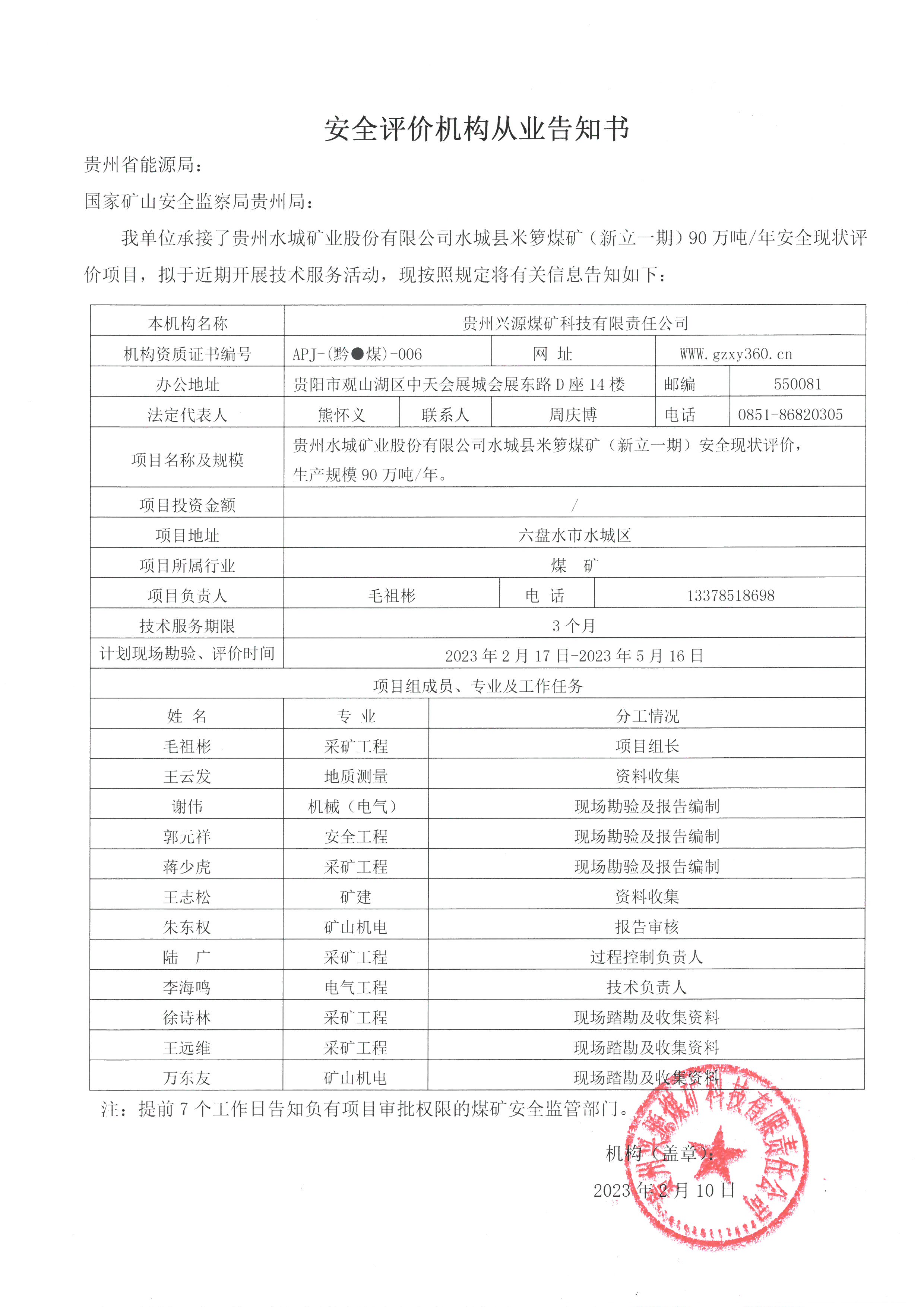 安全評(píng)價(jià)機(jī)構(gòu)從業(yè)告知書【貴州邦達(dá)能源開發(fā)有限公司水城縣勺米老地溝煤礦】