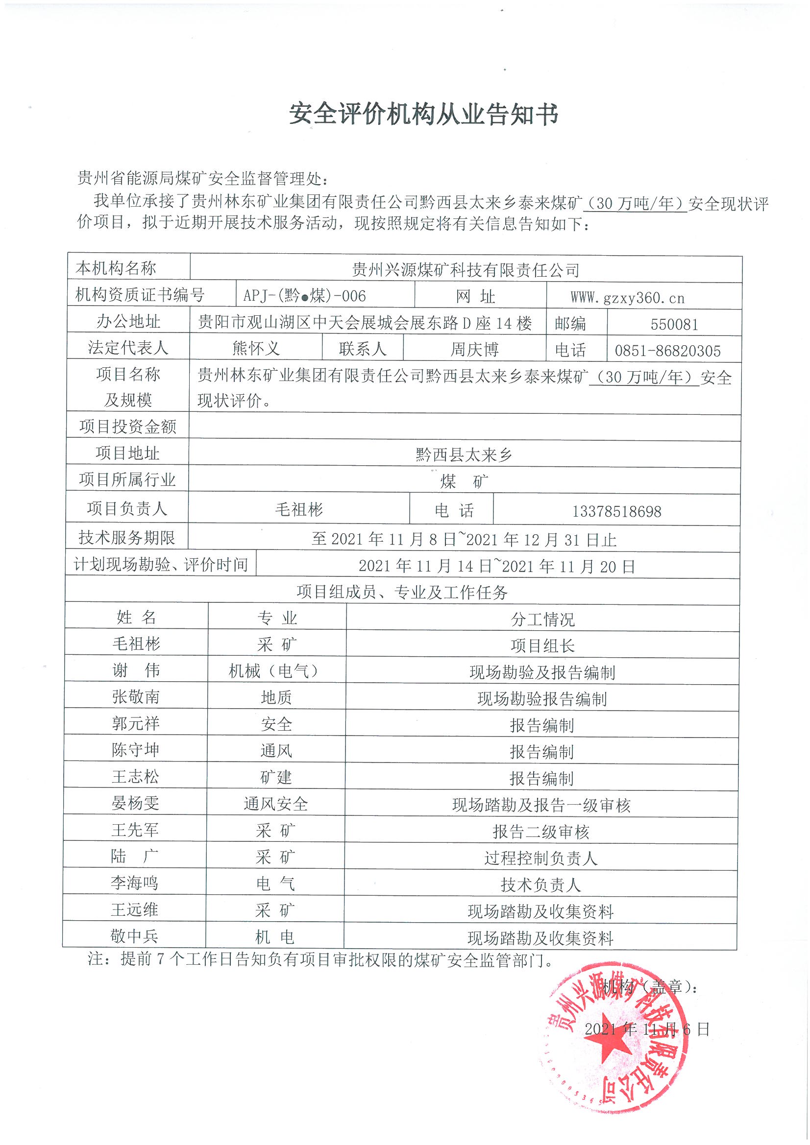 安全評價機構從業告知書(貴州林東礦業集團有限責任公司黔西縣太來鄉泰來煤礦(30萬噸/年)安全現狀評價)