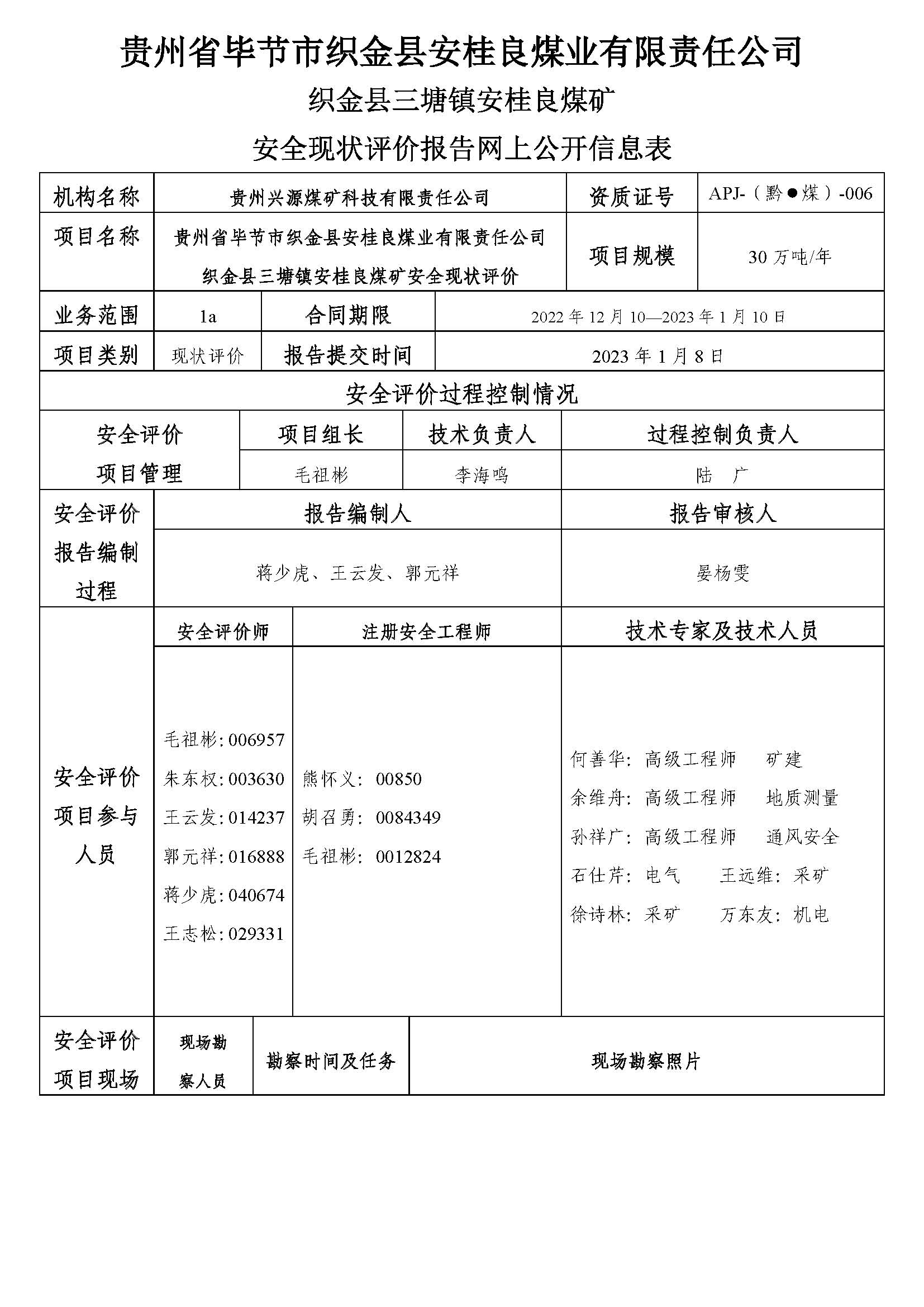 貴州省畢節市織金縣安桂良煤業有限責任公司織金縣三塘鎮安桂良煤礦安全現狀評價報告網上公開信息表