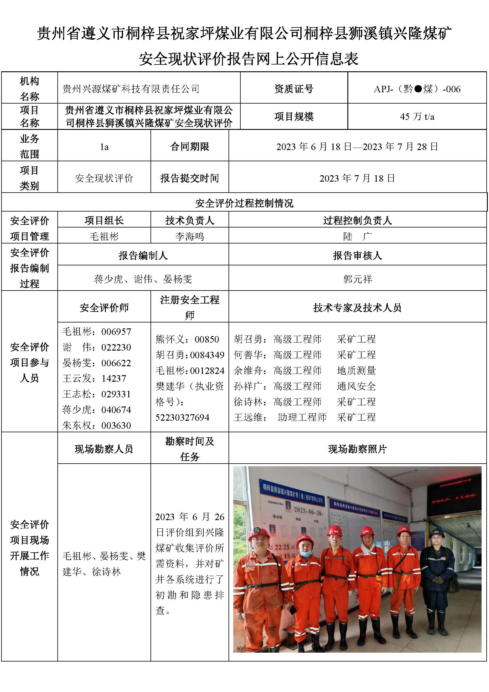 貴州省遵義市桐梓縣祝家坪煤業(yè)有限公司桐梓縣獅溪鎮(zhèn)興隆煤礦 安全現(xiàn)狀評(píng)價(jià)報(bào)告網(wǎng)上公開信息表