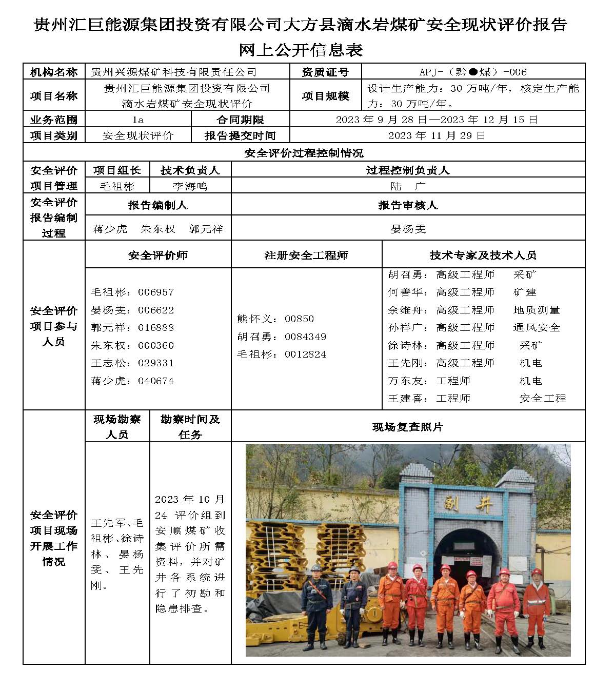貴州匯巨能源集團(tuán)投資有限公司大方縣滴水巖煤礦安全現(xiàn)狀評(píng)價(jià)報(bào)告網(wǎng)上公開(kāi)信息表