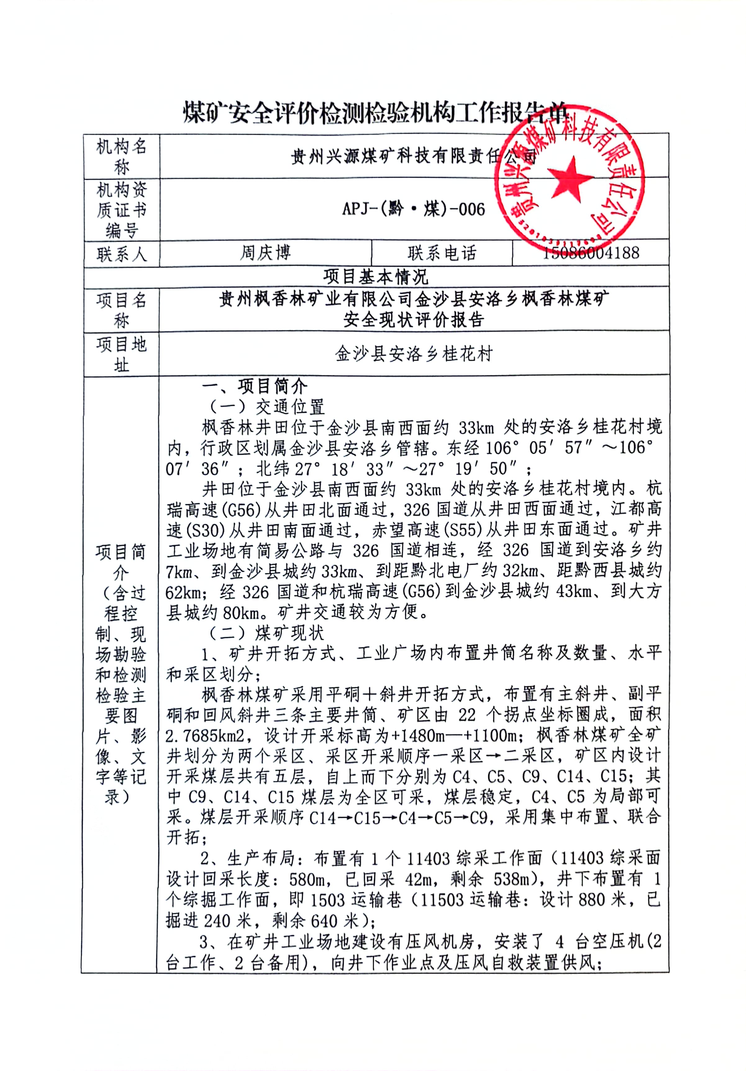 煤礦安全評(píng)價(jià)檢測(cè)檢驗(yàn)機(jī)構(gòu)工作報(bào)告單【貴州楓香林礦業(yè)有限公司 金沙縣安洛鄉(xiāng)楓香林煤礦 安全現(xiàn)狀評(píng)價(jià)報(bào)告】