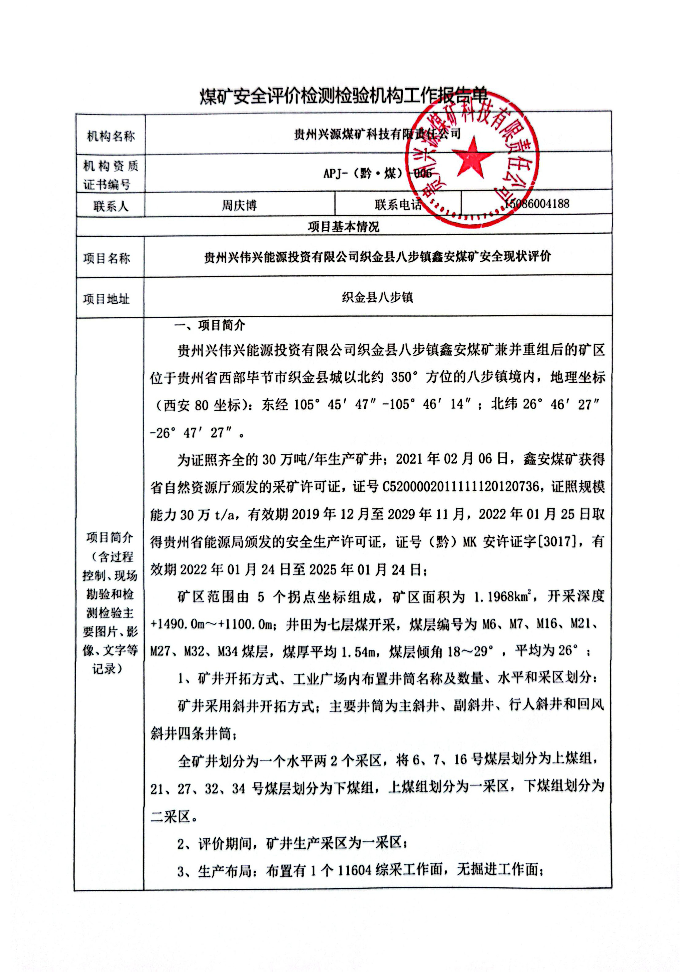 煤礦安全評(píng)價(jià)檢測(cè)檢驗(yàn)機(jī)構(gòu)工作報(bào)告單【貴州興偉興能源投資有限公司織金縣八步鎮(zhèn)鑫安煤礦安全現(xiàn)狀評(píng)價(jià)】