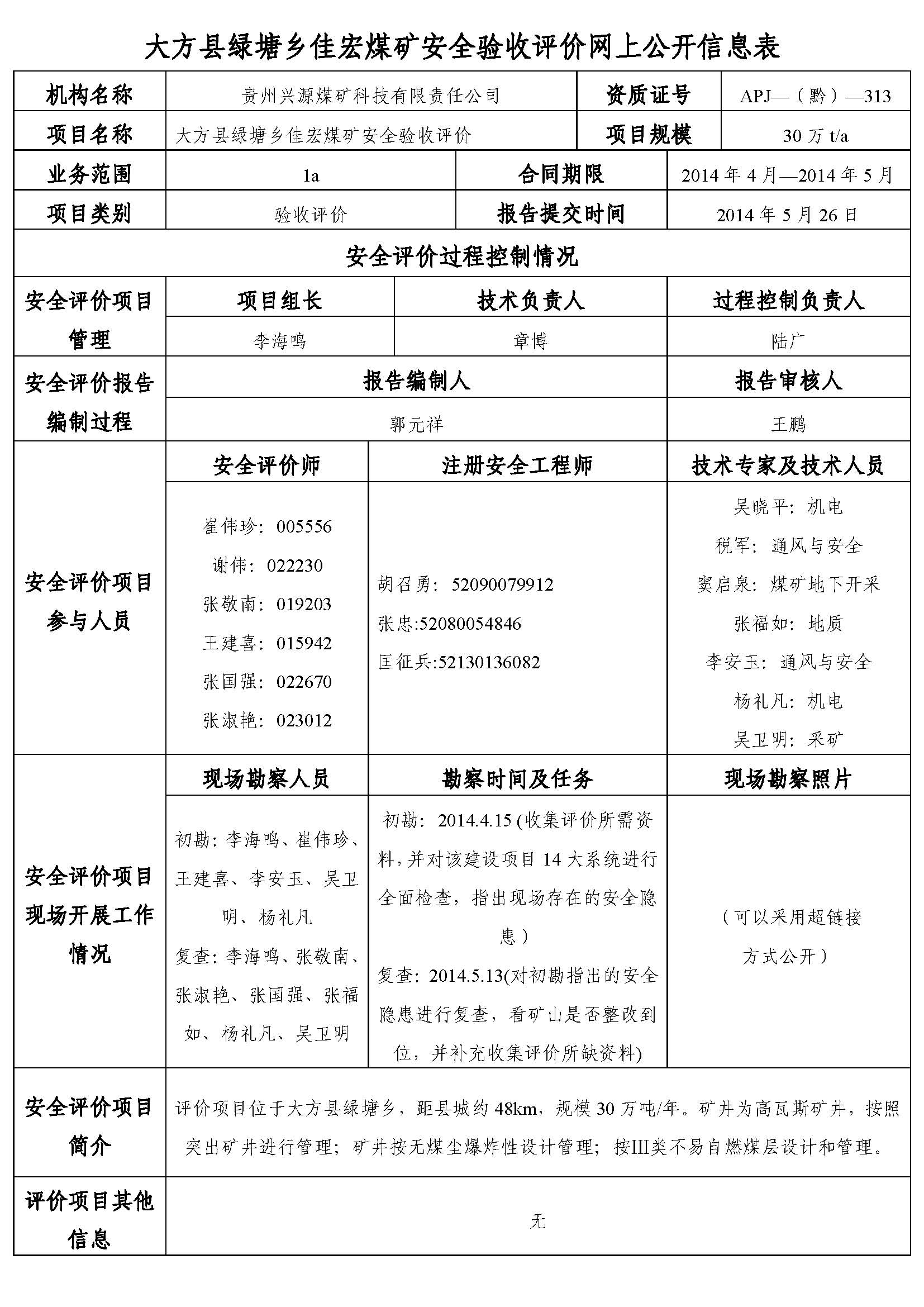 大方縣綠塘鄉佳宏煤礦安全驗收評價網上公開信息表