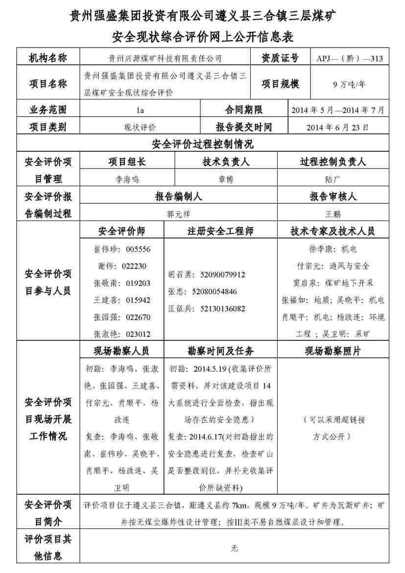 貴州強盛集團投資有限公司遵義縣三合鎮三層煤礦安全評價業務網上公開信息表