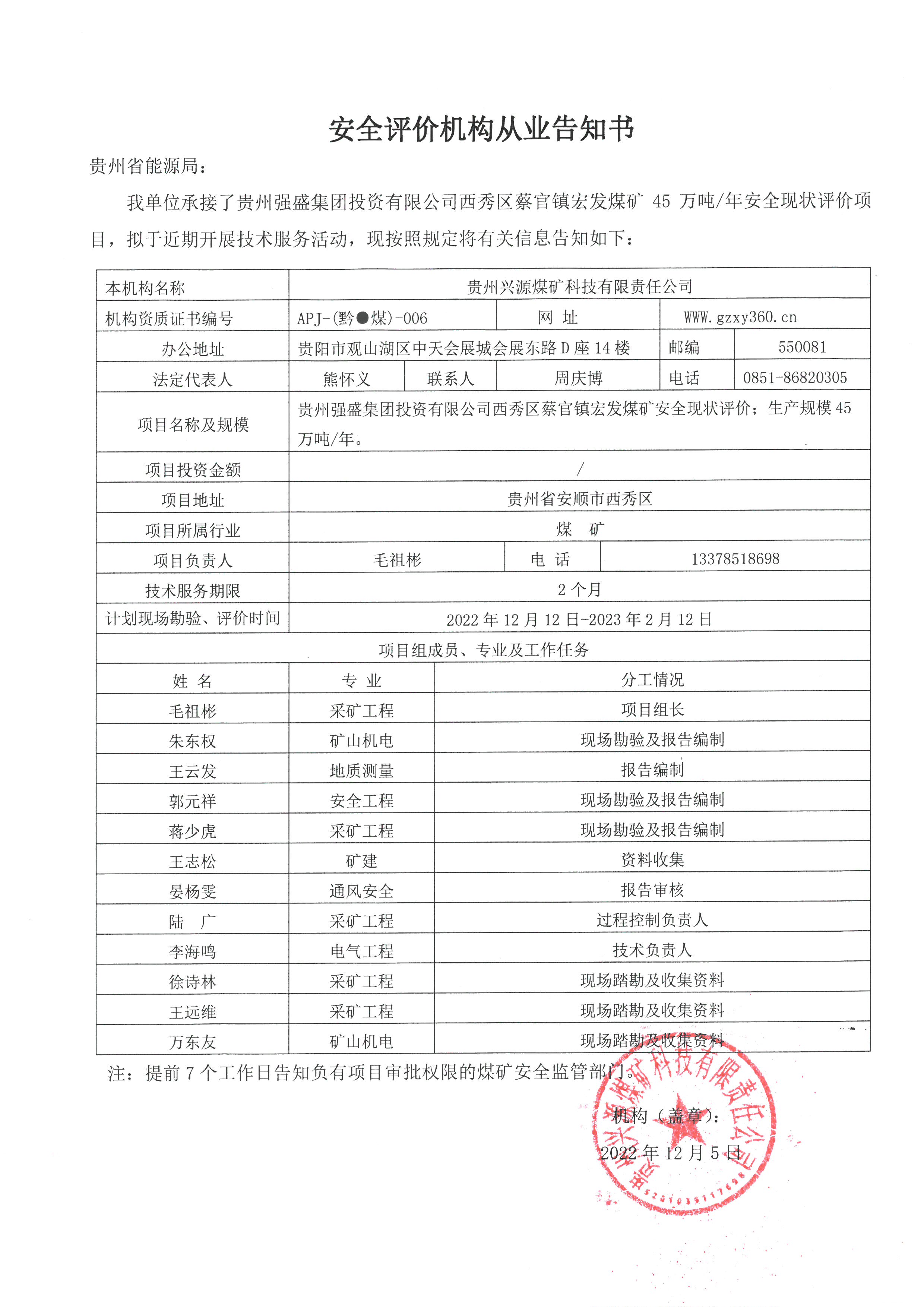 煤礦安全評價機構從業告知書【貴州強盛集團投資有限公司西秀區蔡官鎮宏發煤礦】