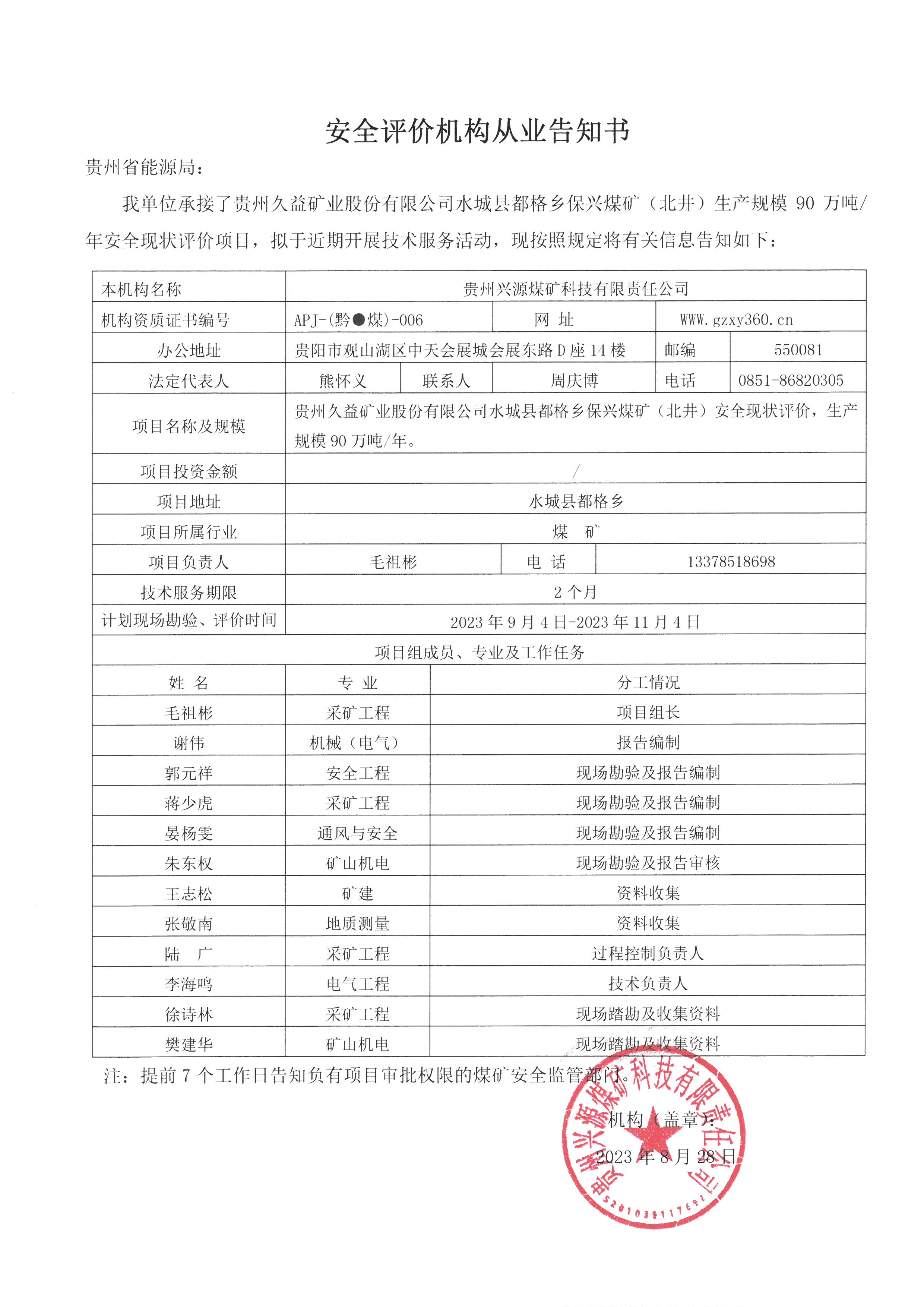 安全評價機構從業告知書【貴州久益礦業股份有限公司水城縣都格鄉保興煤礦(北井)】