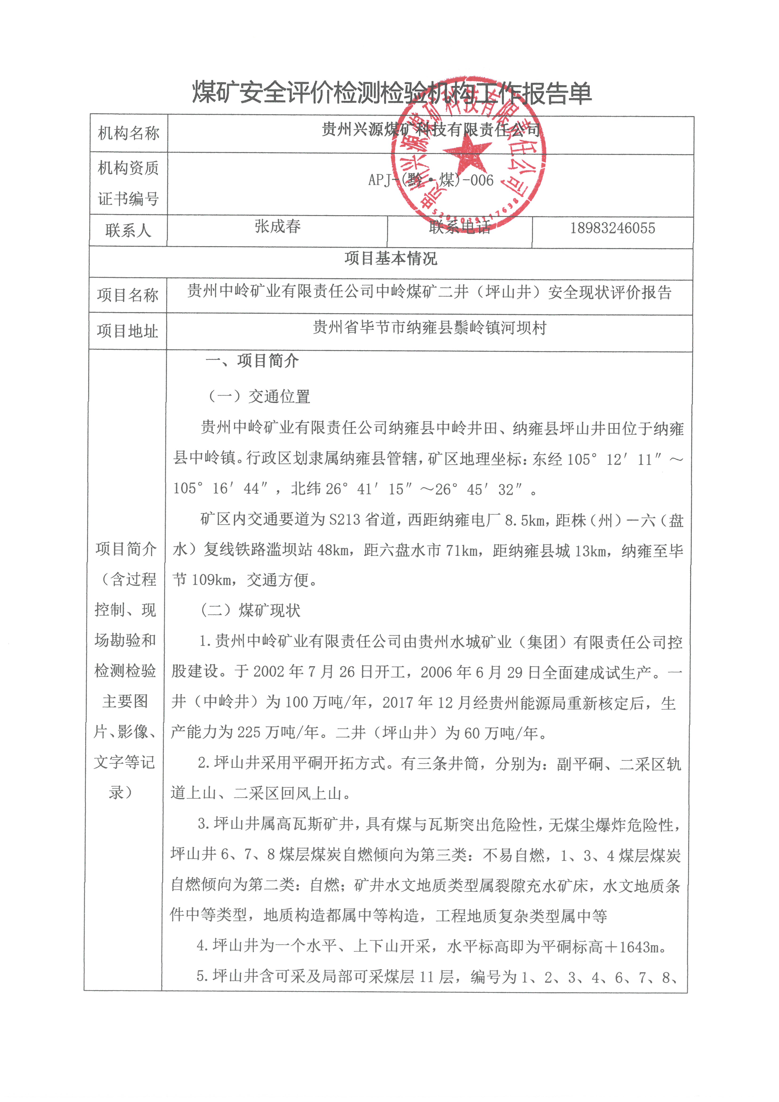 煤礦安全評價檢測檢驗機構工作報告單【貴州中嶺礦業(yè)有限責任公司中嶺煤礦二井(坪山井)安全現(xiàn)狀評價報告】