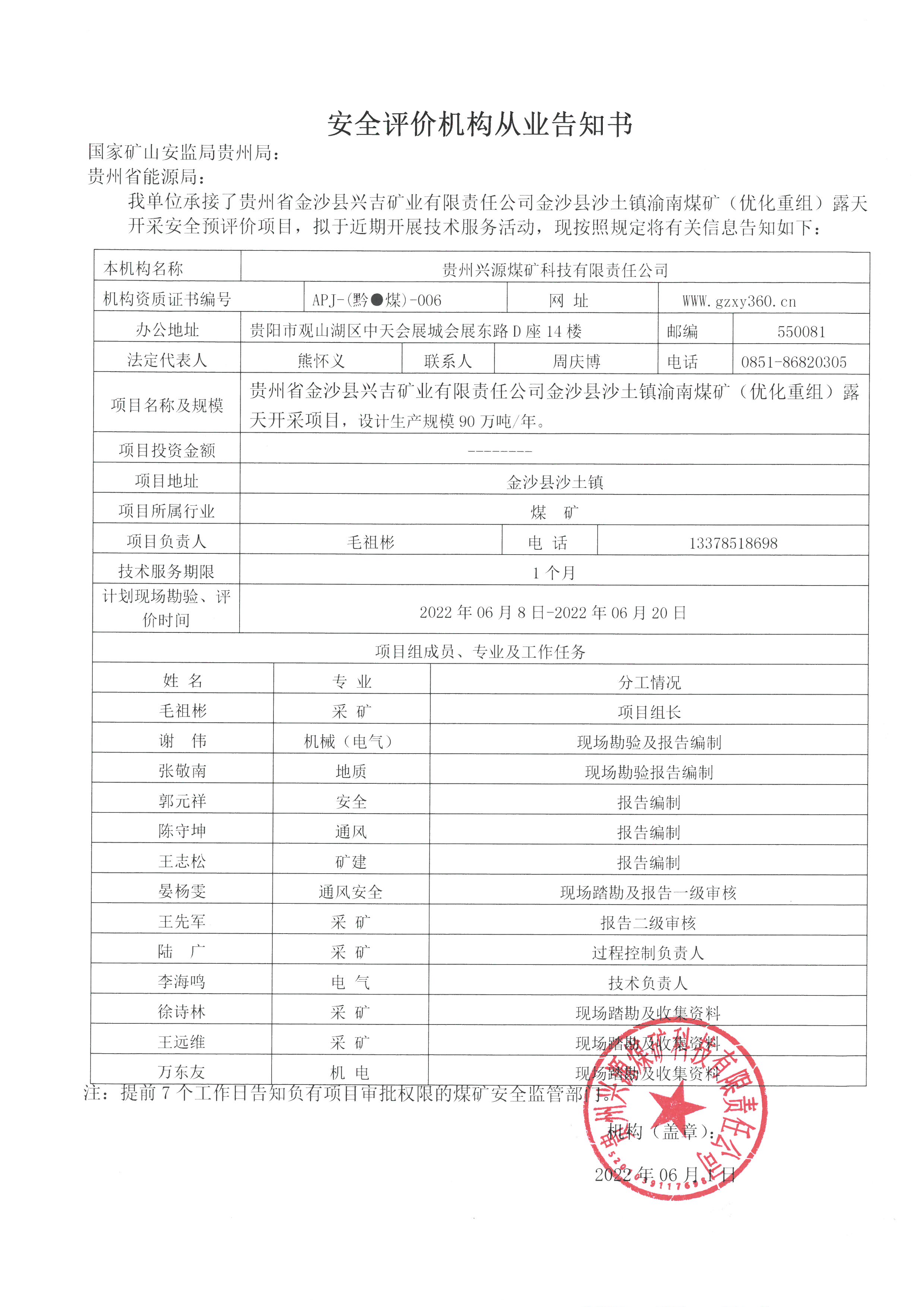 安全評價機構從業告知書(貴州省金沙縣興吉礦業有限責任公司金沙縣沙土鎮渝南煤礦(優化重組)露天開采安全預評價項目)