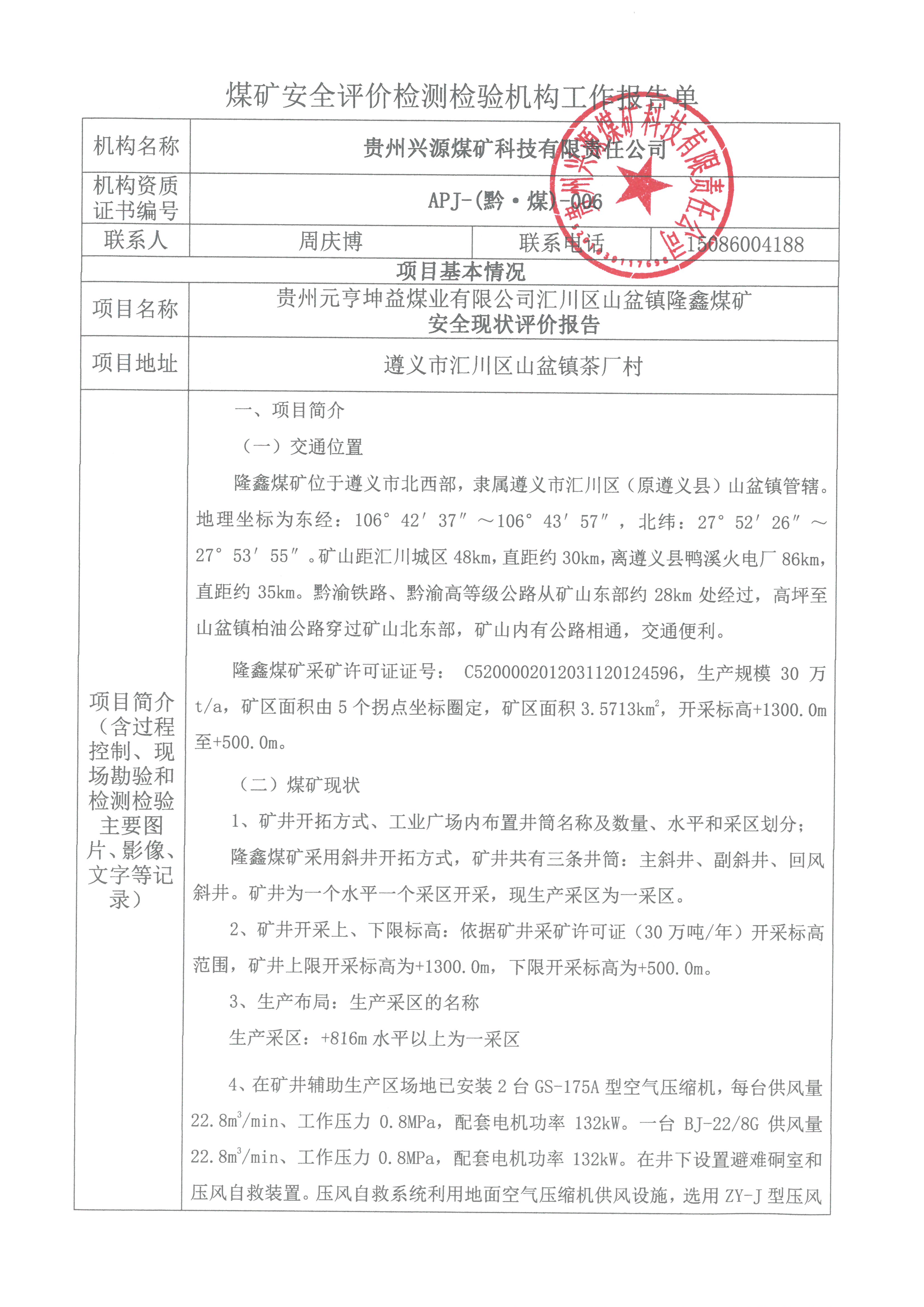煤礦安全評價檢測檢驗機構工作報告單【貴州元亨坤益煤業有限公司匯川區山盆鎮隆鑫煤礦安全現狀評價報告】